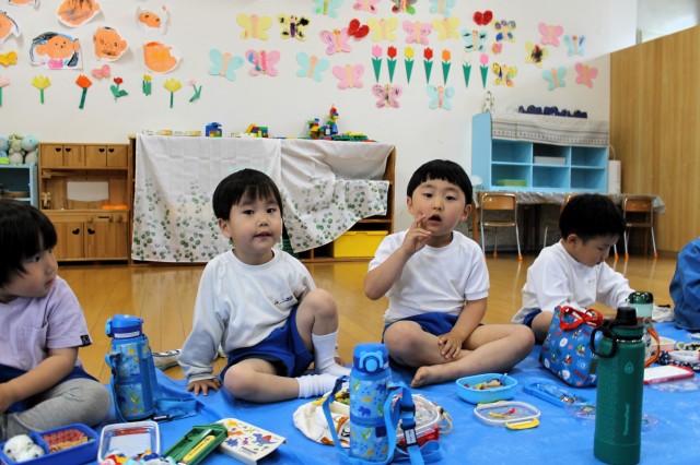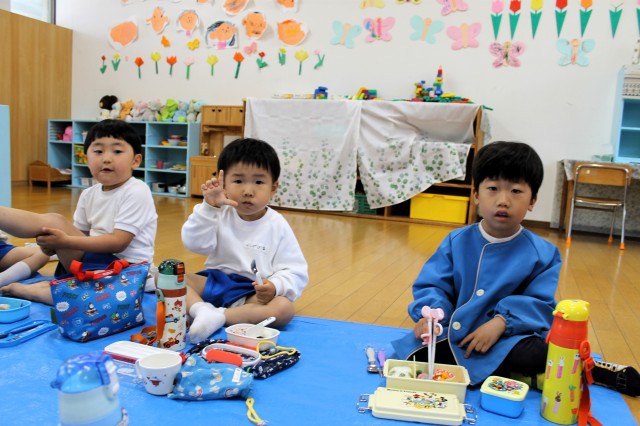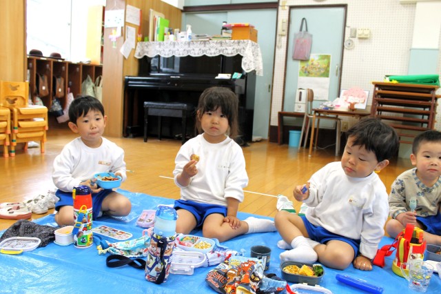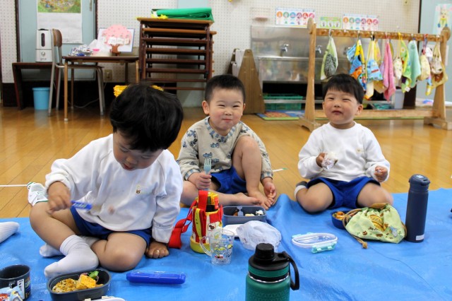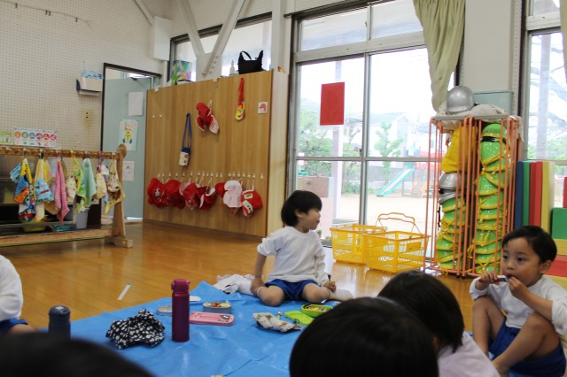 今日はお部屋にレジャーシートをひいて、みんなでお弁当を食べました!