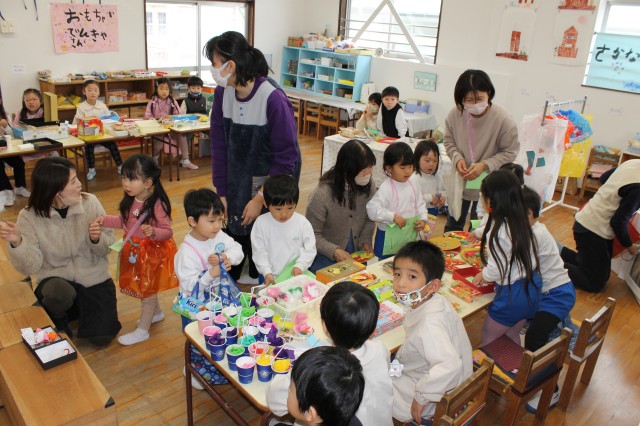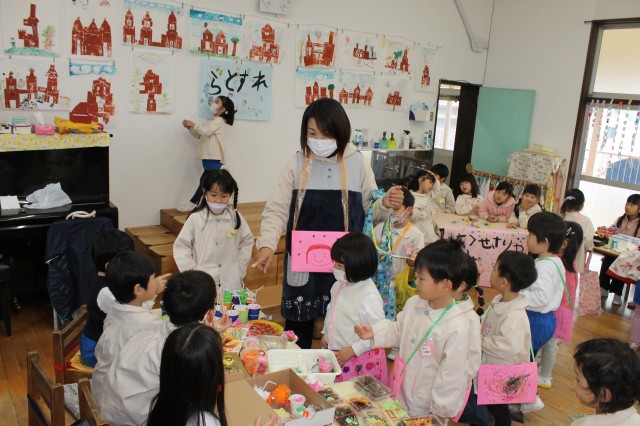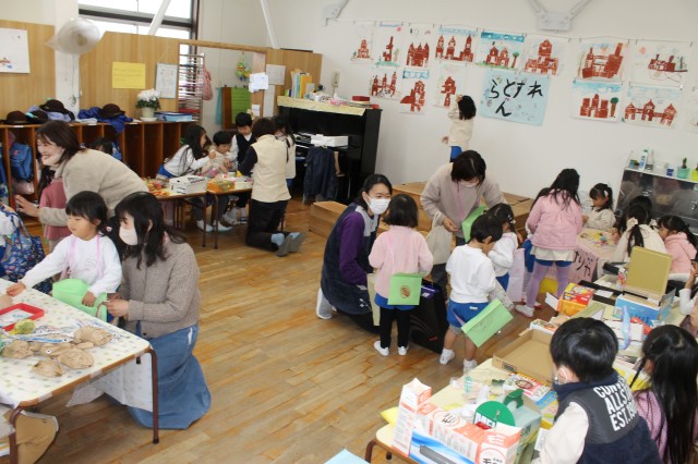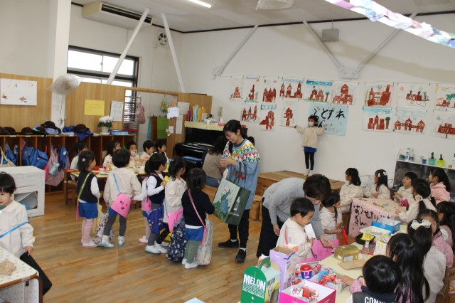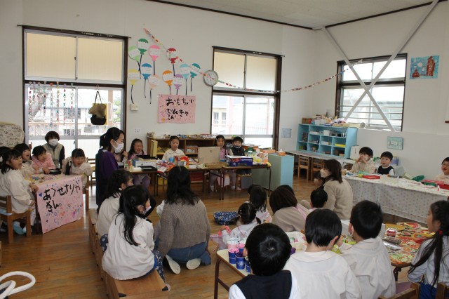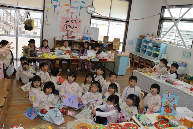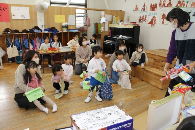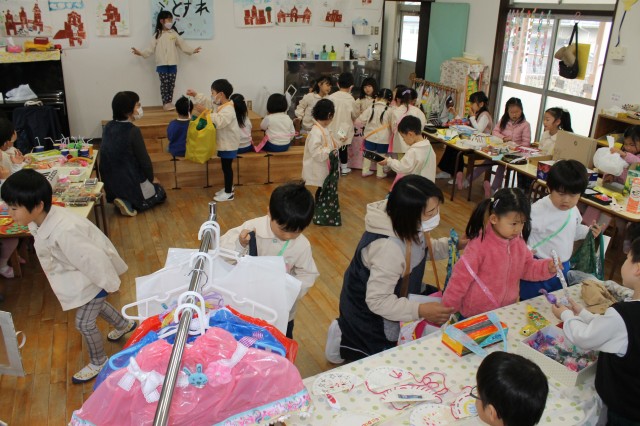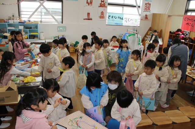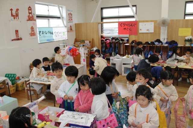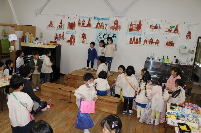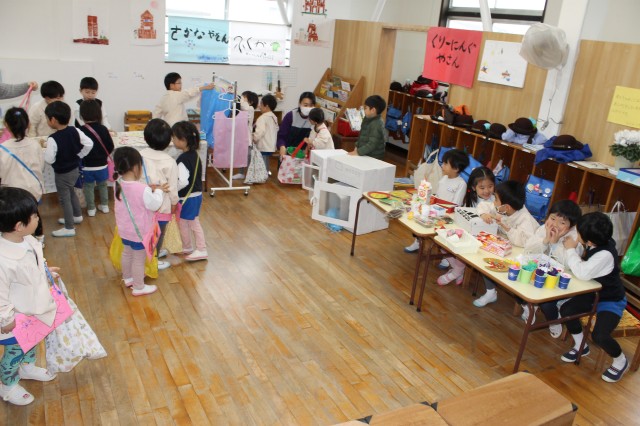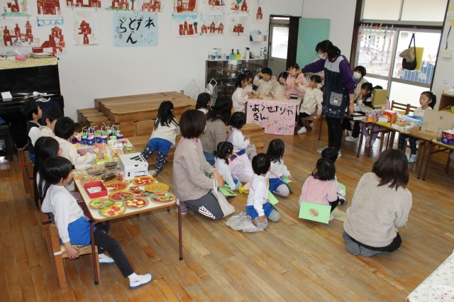 たんぽぽ組がお店屋さんになって、つぼみ組、ちゅうりっぷ組、もも組、ばら組をむかえました。
