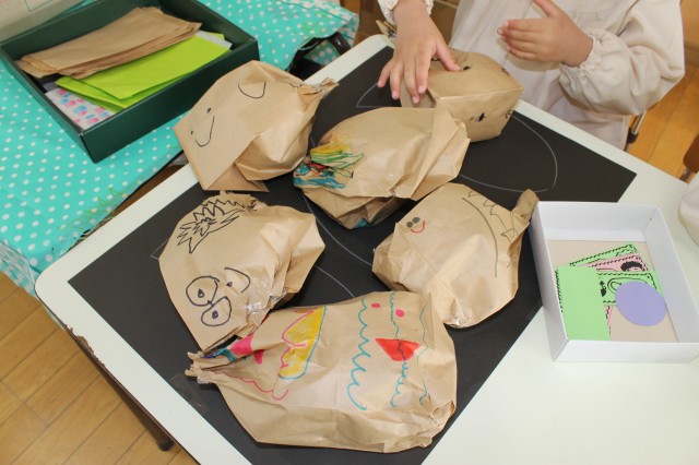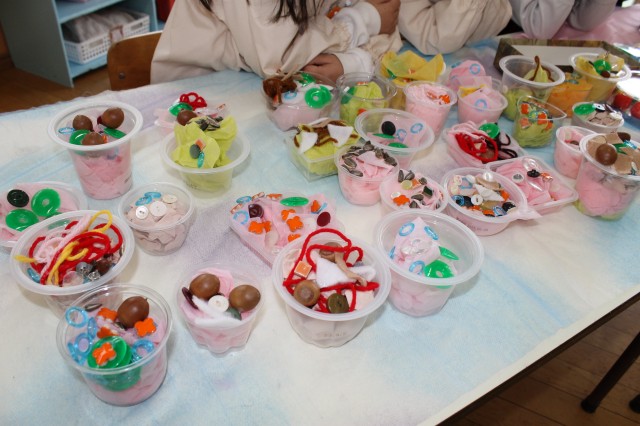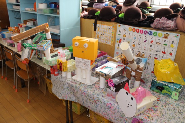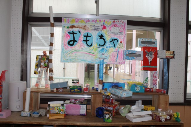 色々な素材を工夫して使ったり、友達と共同で作ったり、とりあえず材料集めからして、作る物を考えたり、子ども達は頭をいっぱい使い、指先をいっぱい使い、できた品物はどれも立派で、かわいくユニークな物にあふれていました。