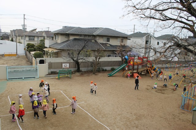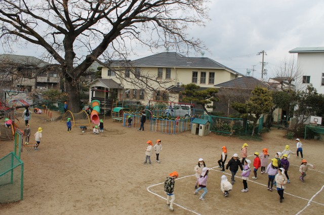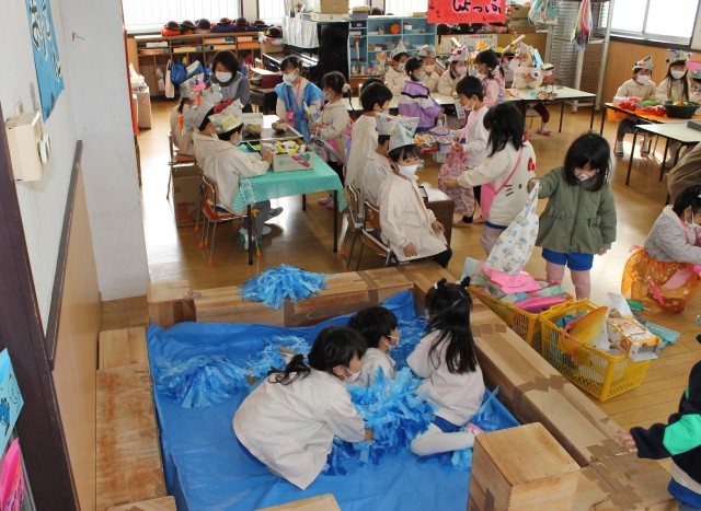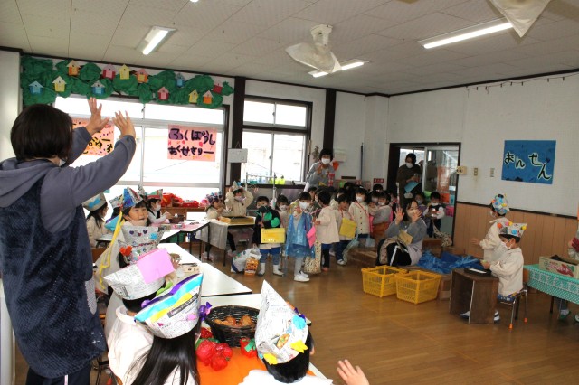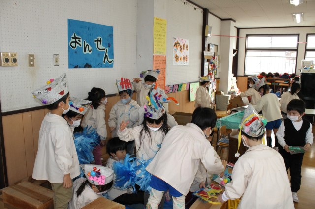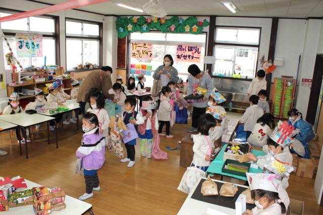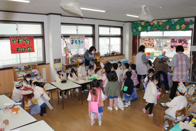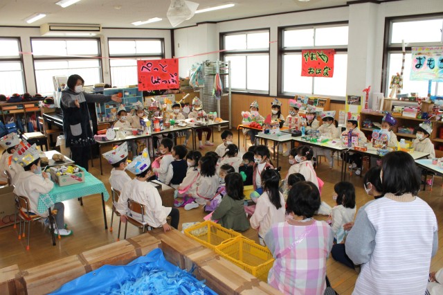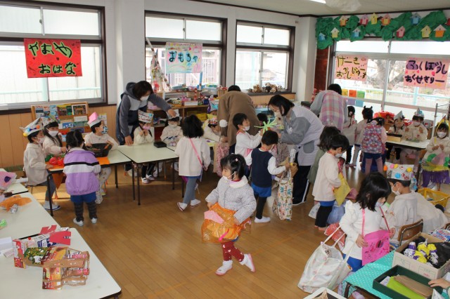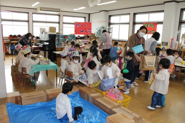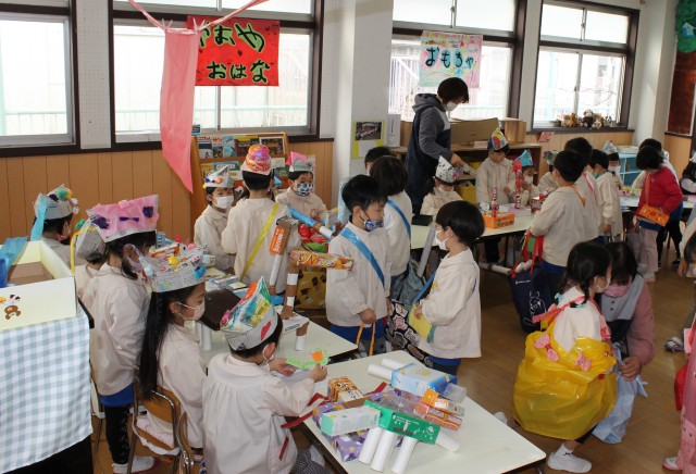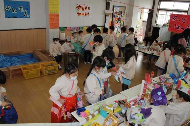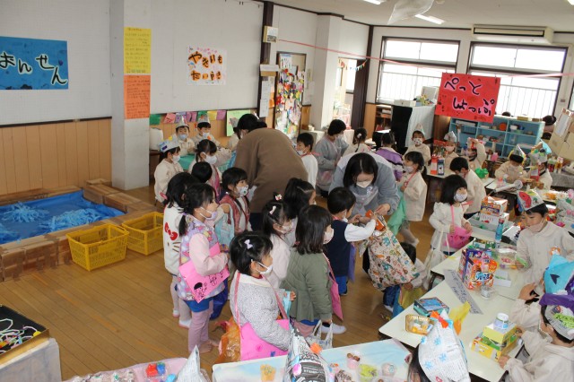 お店屋さんごっこが終わり、外遊びのあと、つぼみ組さんにも品物をプレゼントしたばら組さんでした。
