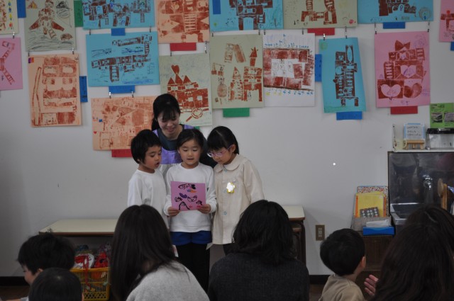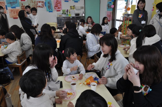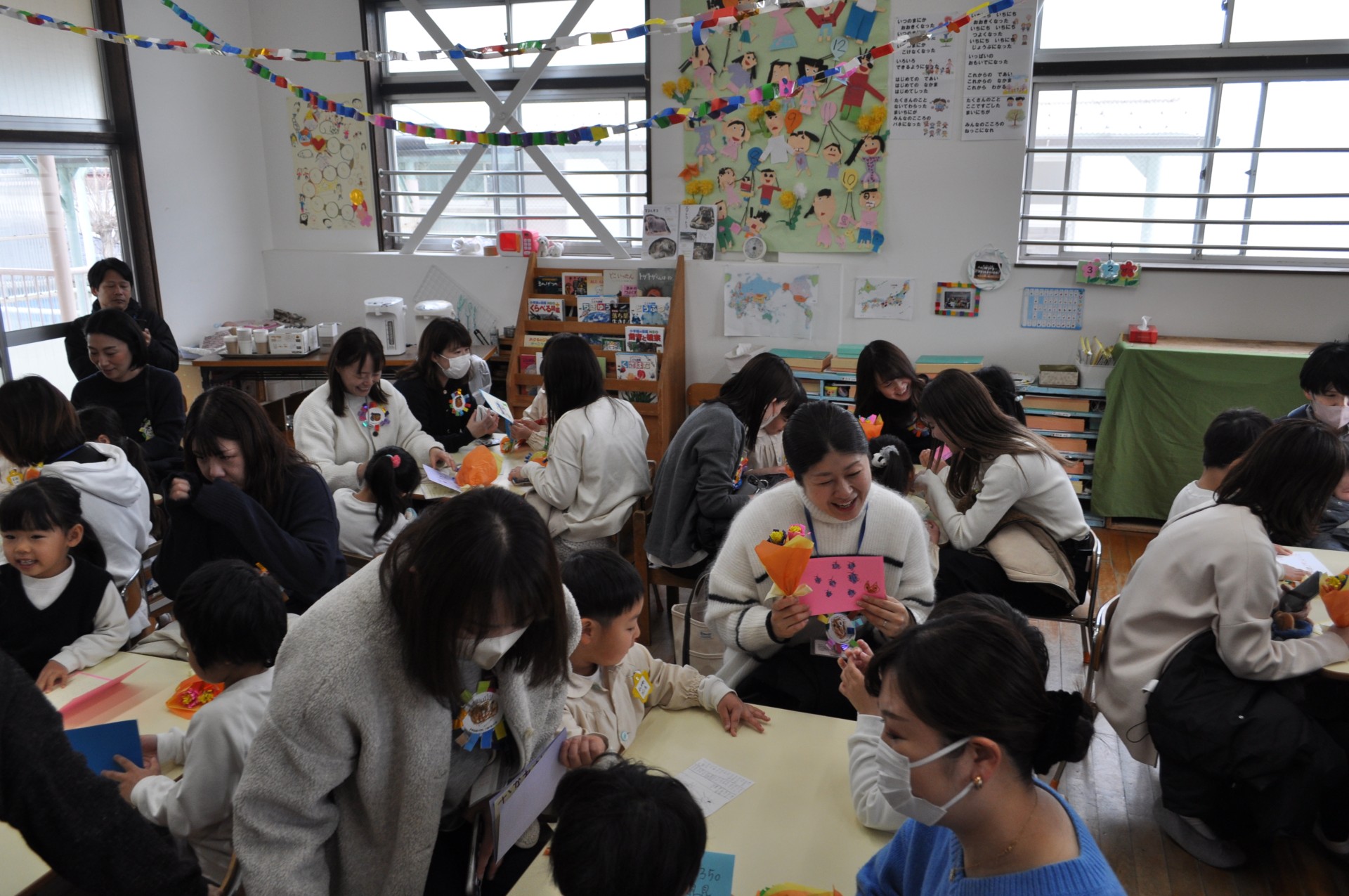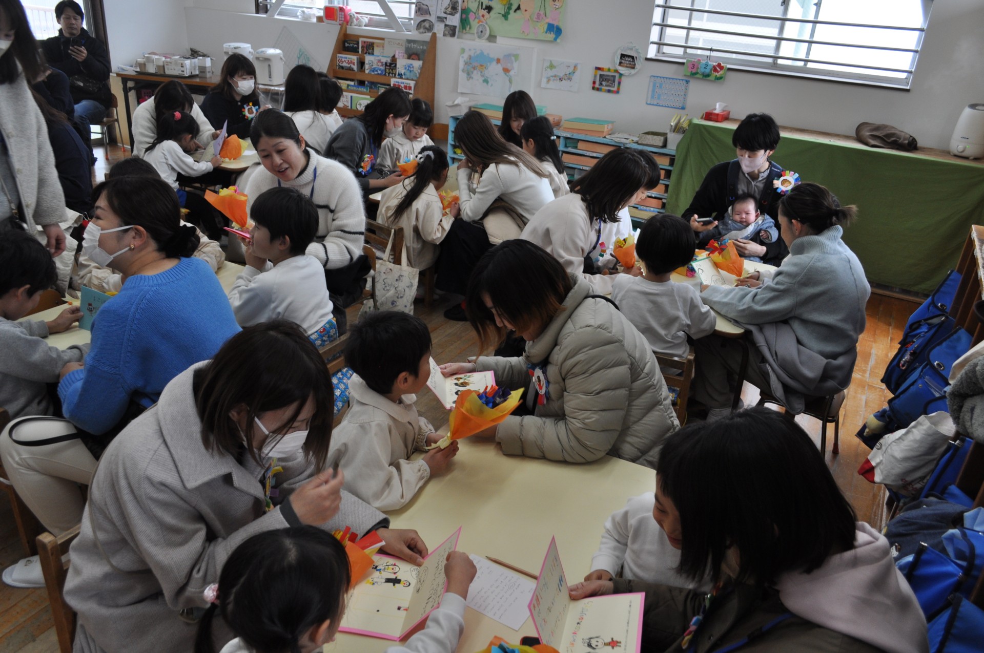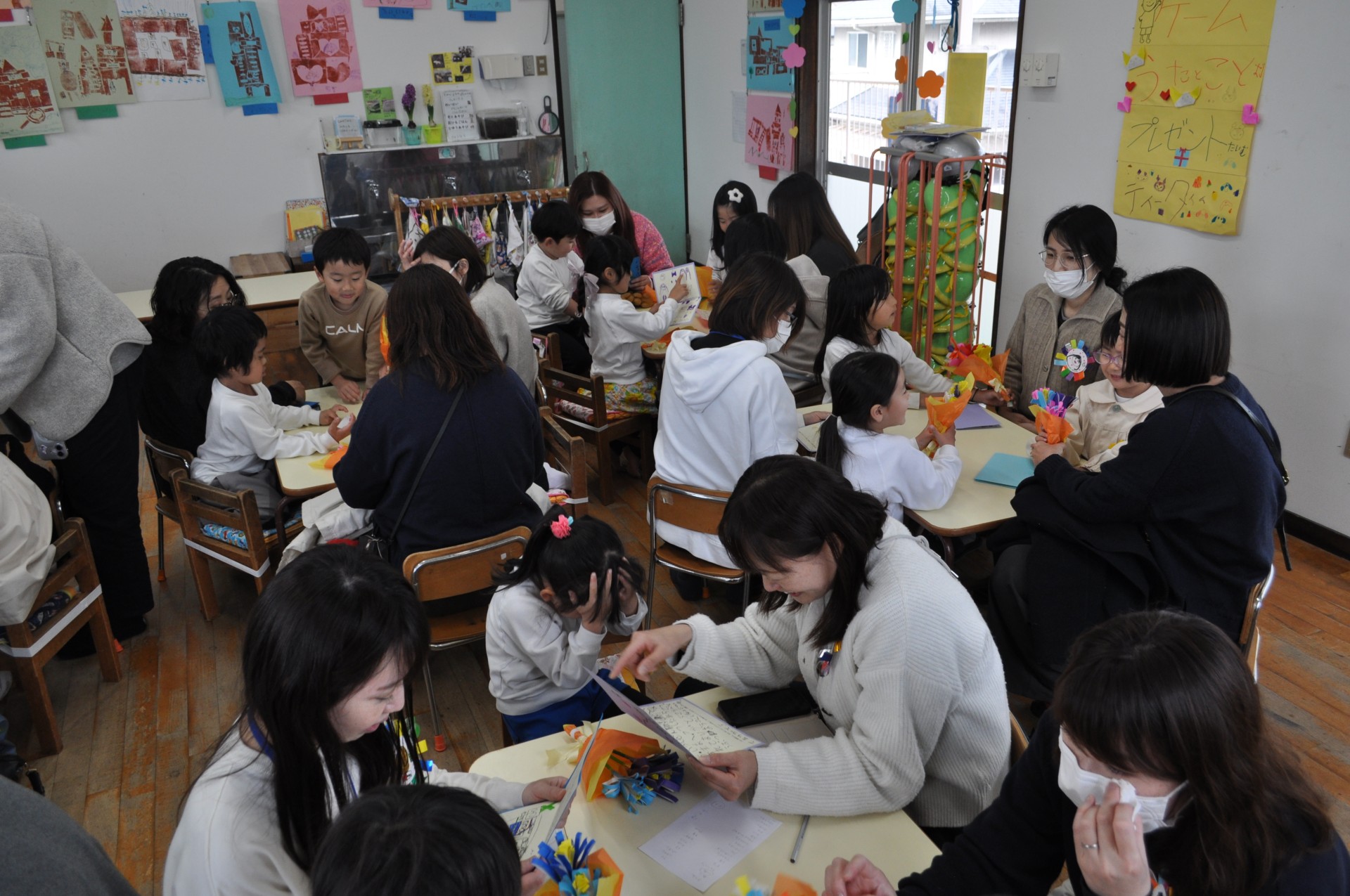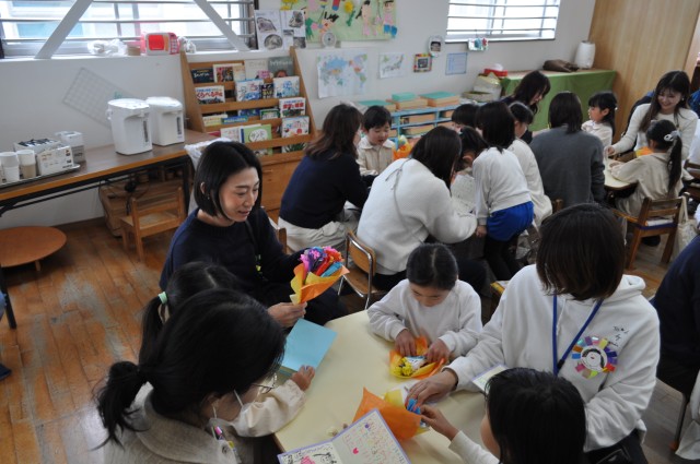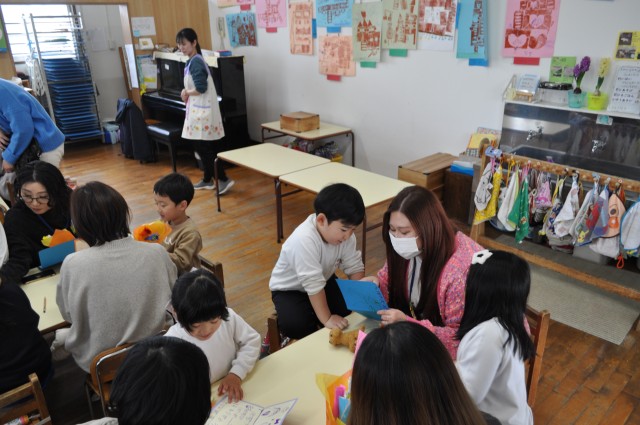 折り紙で1本1本丁寧に作ったお花の花束とお手紙を渡しました。渡した子どもたちも、もらった保護者の皆さんも、嬉しい時間でしたね。
