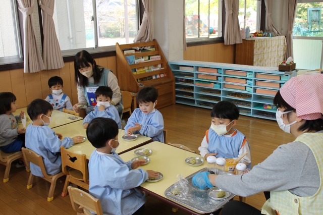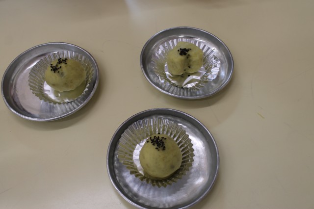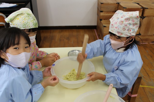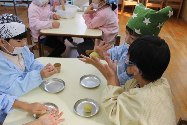 水曜日に園庭で焼いたお芋で、スイートポテトを作りました。バターとお砂糖を少し入れたたねを年長組はすりこぎでつぶすところから、他のクラスは自分の好きな形に丸めます。アルミホイルの上に載せたら、ランチの先生にはちみつを塗ってもらい、その後自分でごまをふりふり~♪