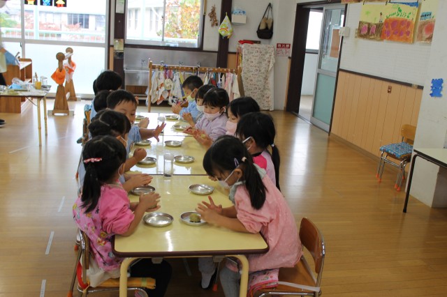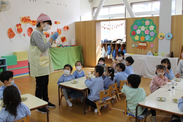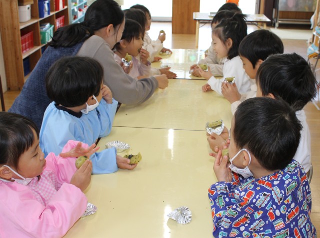 美味しく焼いてくるね~とオーブンで焼きに行ってくれました。10分ほどで焼き上がり、みんなでいただきます!一口ほおばって、わぁ美味しい♡あったかいね♡はじめて食べた…美味しいわ~などなど、嬉しい声が聞こえました。お芋が少し苦手な人も、一口味わえたそうです。
