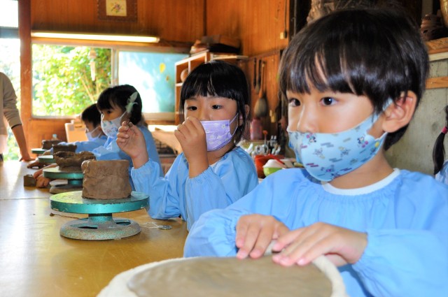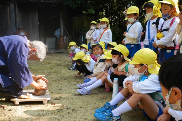 お皿とお茶碗の作り方を、実演しながら土をこねる先生の手を通して、