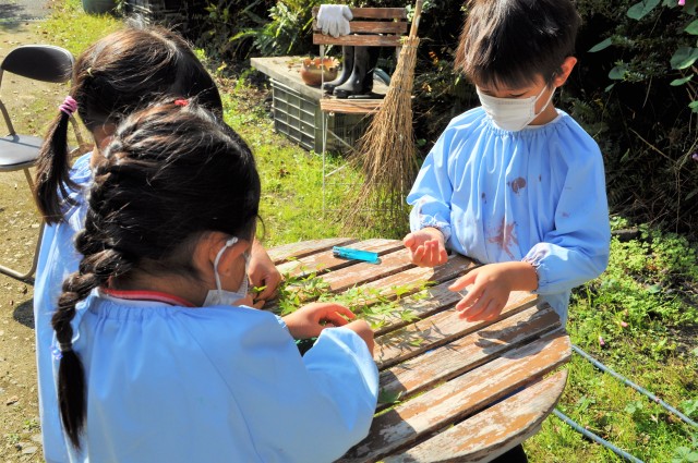 仕上げた後の飾りは、お庭の葉っぱや先生の作られたの陶器の判子etc....