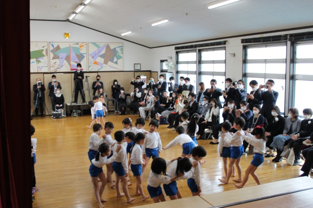 今まで、緊張が続いていましたが、リズムに合わせて身体を伸び伸びと動かす時は生き生きとした顔でした。舞台上で歌った「なかま は たから」と「さよなら ぼくたち の 幼稚園」は普段の様に大きな声で歌っていました。