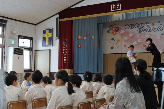 名前が呼ばれたら、返事をし、舞台の上へ。園長先生から証書とお花を受け取り、家族へ渡す。たくさんの拍手は大好きな家族と友達からあり、緊張していた顔がホッと緩んで笑顔で舞台から降りてきました(^^)/