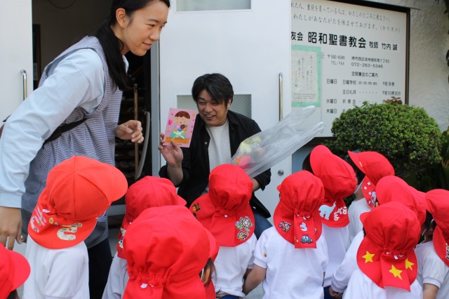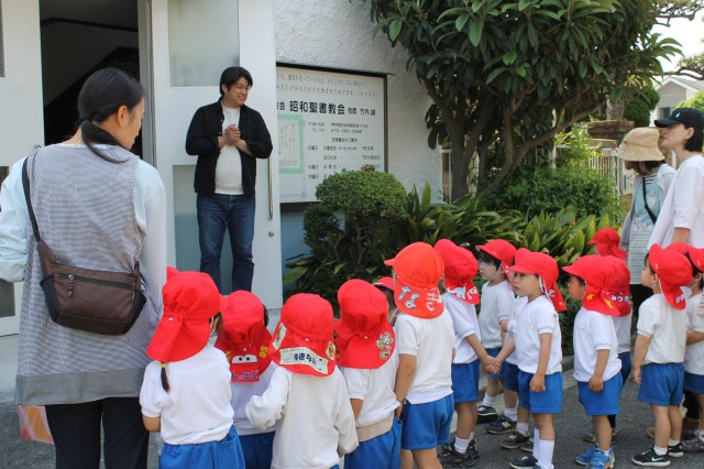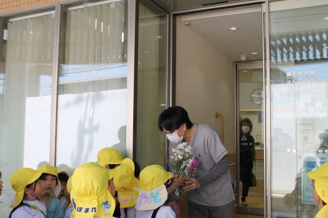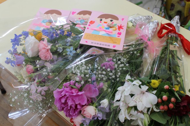 先生が、今日の訪問先の分、お部屋に飾る分を分けて花束にしてくれました。みんなで神さまに感謝の礼拝をおささげしてから、園庭に並びそれぞれの担当の訪問先に出発です。一番小さなつぼみ組さんはお台所のランチの先生。年少組は、お隣の教会の牧師先生に。年中組は地域の郵便局の局長さんに。そして、年長組はお隣の町の園医さんを3軒も周りました。たくさん歩いて疲れたけれど、いつもありがとうございます♡と、花束とカードをお渡しして、「ありがとうねーきれいなお花嬉しいです!」と喜んでもらえると、皆嬉しくなりました♡いろんな機会に、神さまに心を向けて感謝することを覚えていたいです。