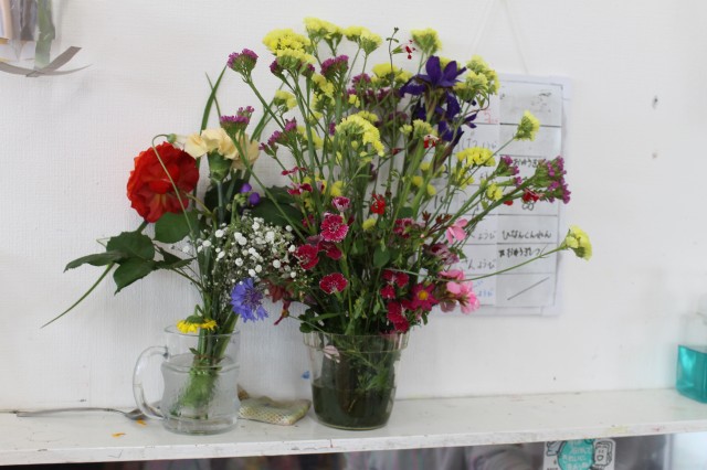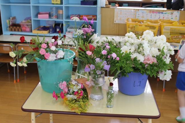 当日の朝、きれいな色とりどりのいろんな種類のお花が各ご家庭から届きました。お家や、おじいちゃんおばあちゃんのお庭で咲いていたお花、お店でおうちの人と一緒に選んでくれたお花など、みんなの持って来てくれたお花を集めて、テーブルの上に置くととっても華やかです。