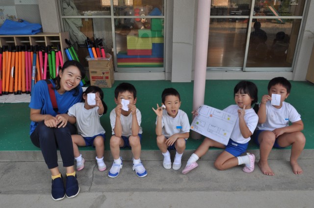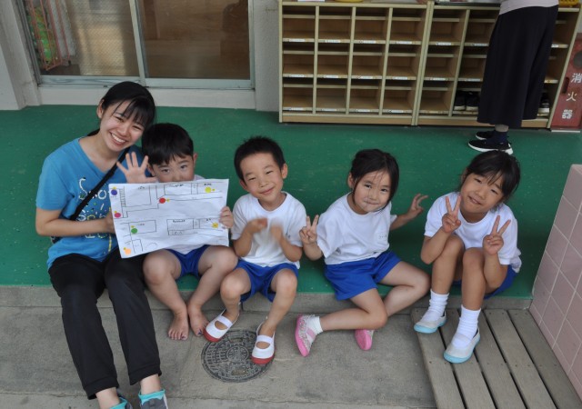 幼稚園の地図を持って「ハイ、チーズ!!」チーム全員でゴールすることができましたよ☆