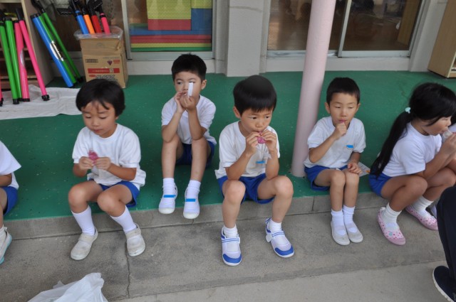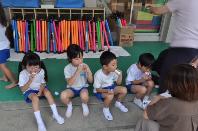 オリエンテーリングを楽しんだ後は、ご褒美のパピコタイム!! 冷たいパピコをみんなでいただきました。「おいしい~」 「うれしい~」 特別なご褒美ですね!!