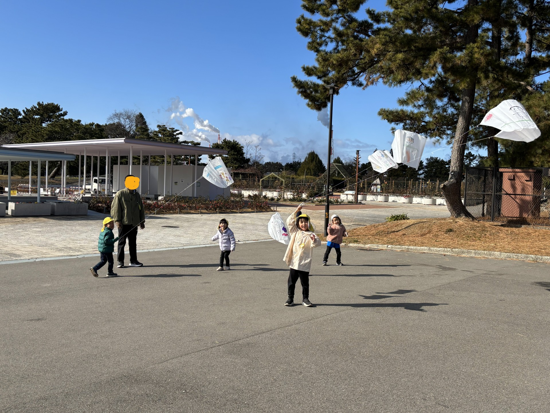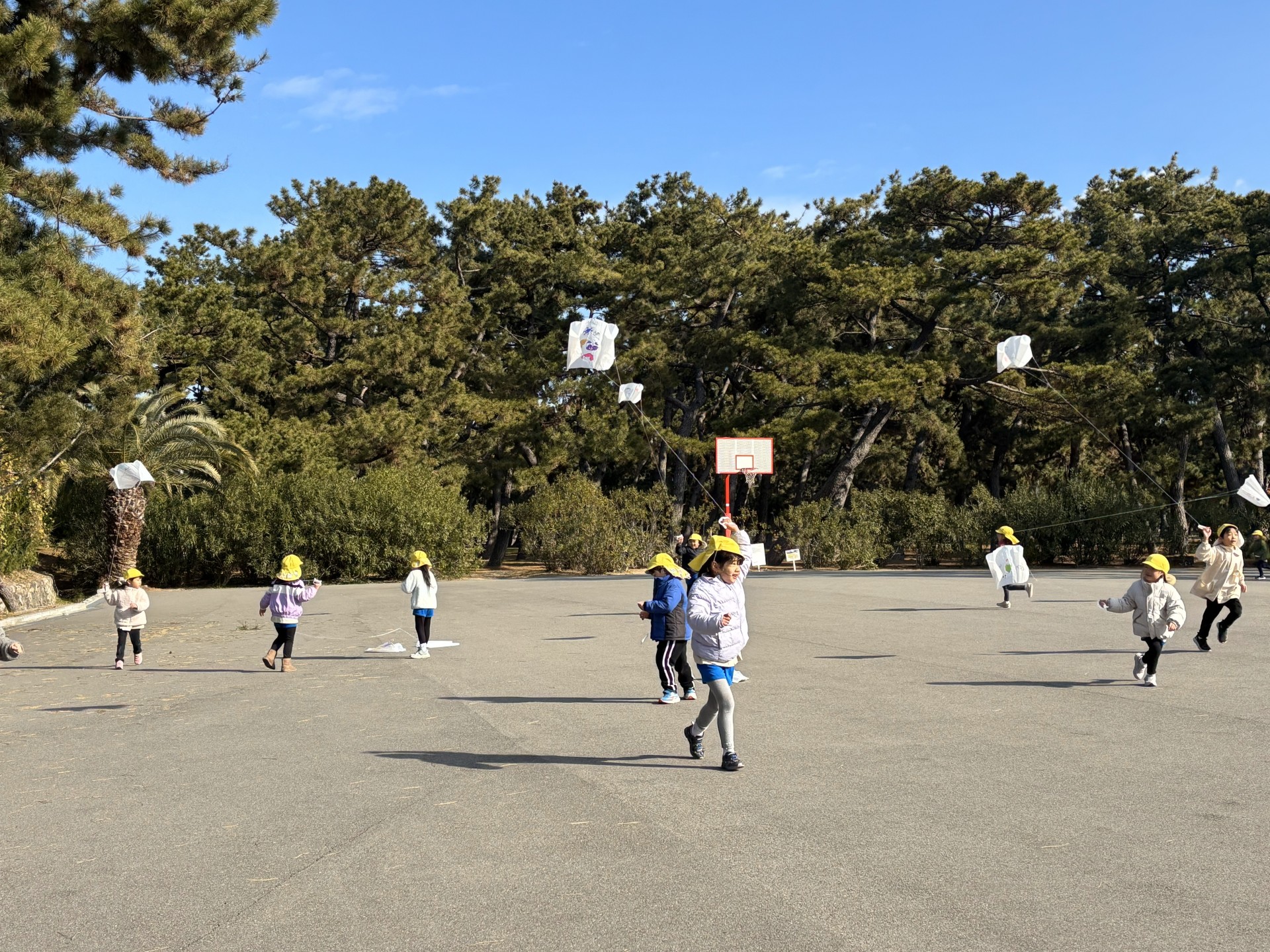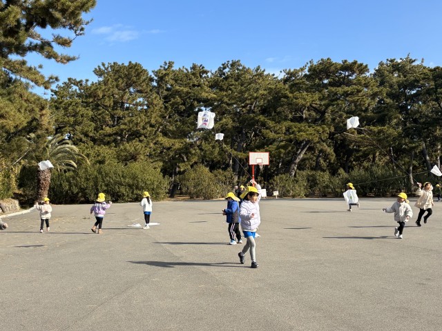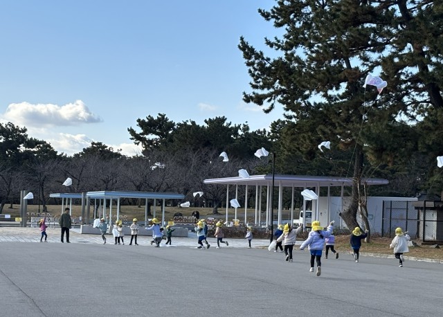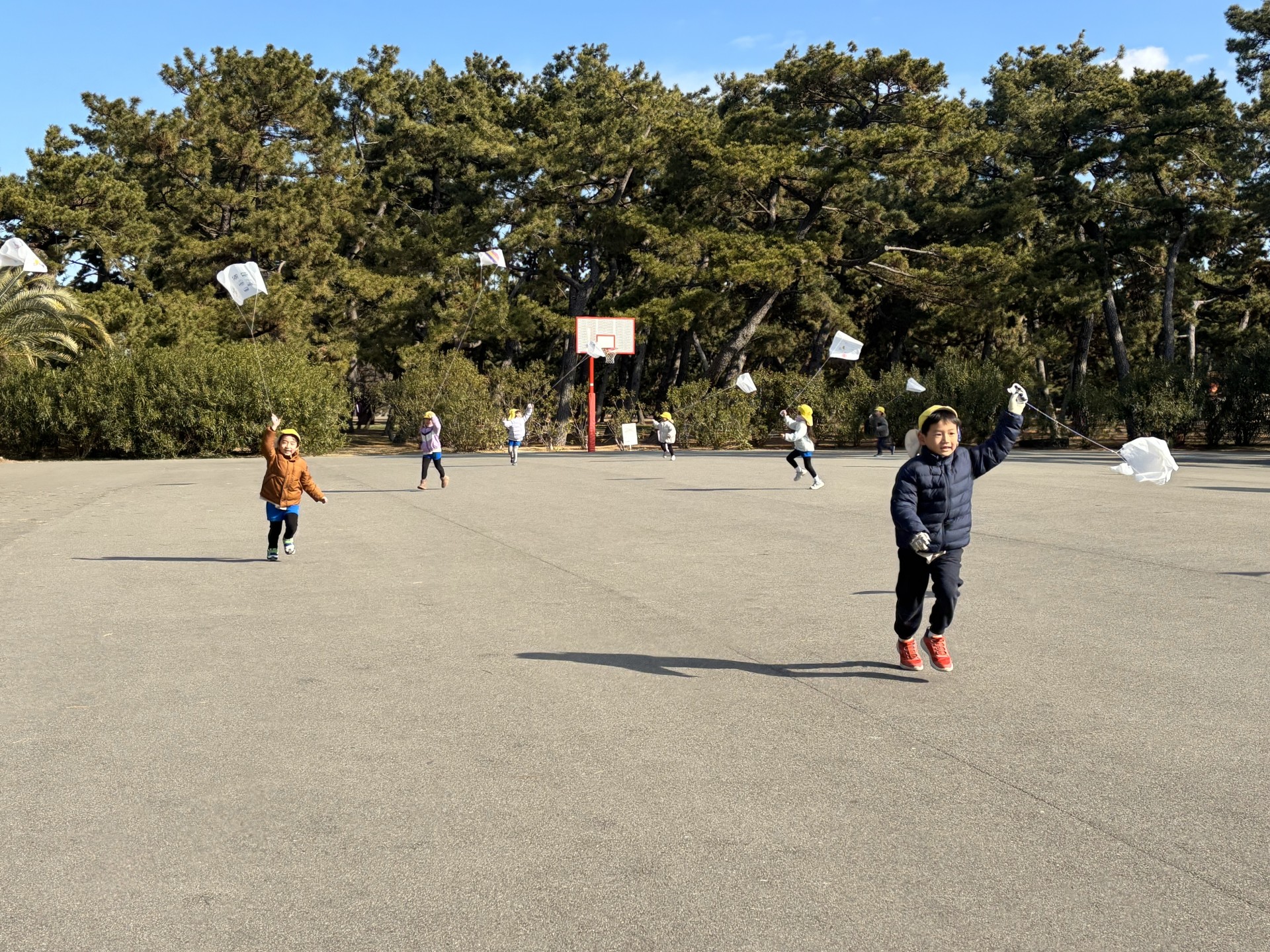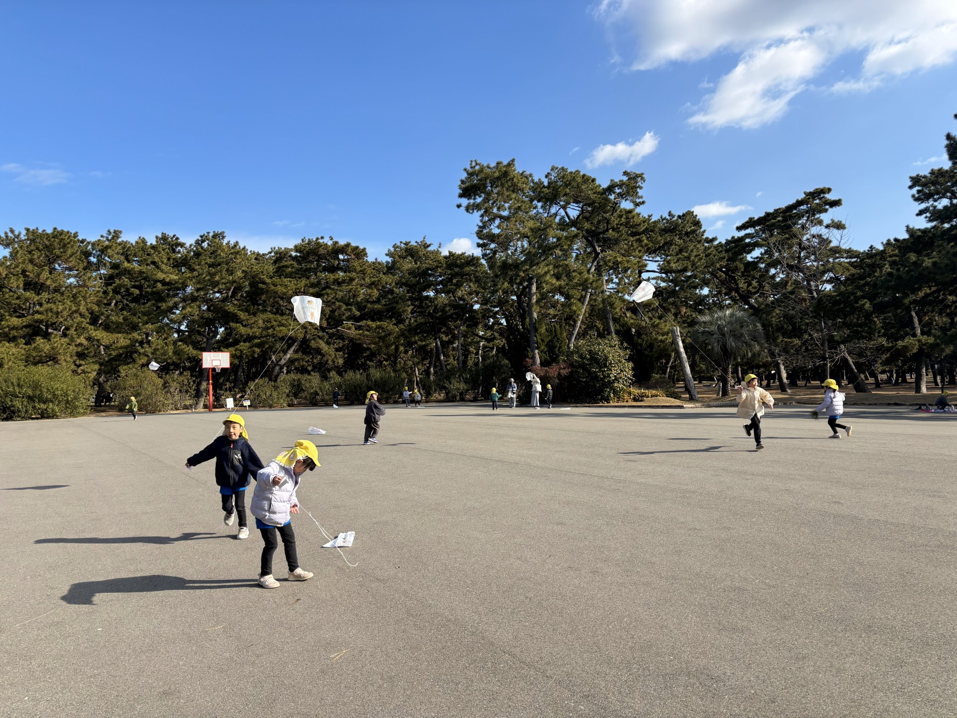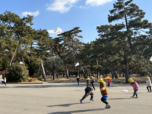 浜寺公園では、広い広場で、思いっきり走り回りながら凧あげをしました。「みて~飛んでる!!」と嬉しそうな表情になるたんぽぽ組のみんな。