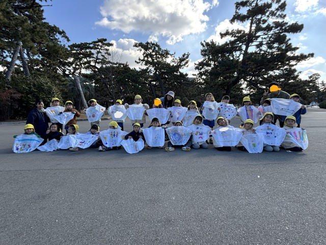 前日の凧あげ準備では、それぞれの凧に絵を描きました。好きなキャラクターを描いている子や、自分の顔を描いている子など、時間をかけて丁寧に取り組む姿がありました。「明日、楽しみ~!!」と言っていた子どもたち。