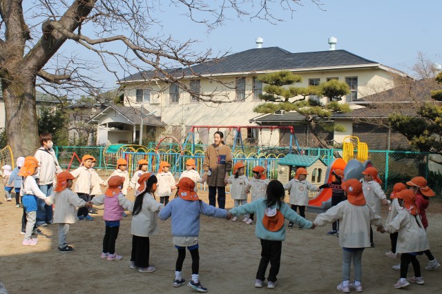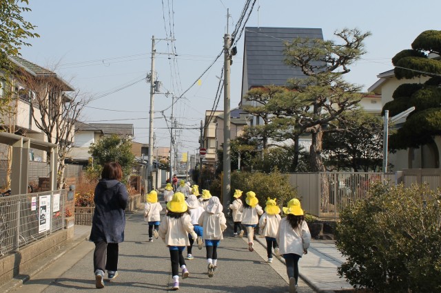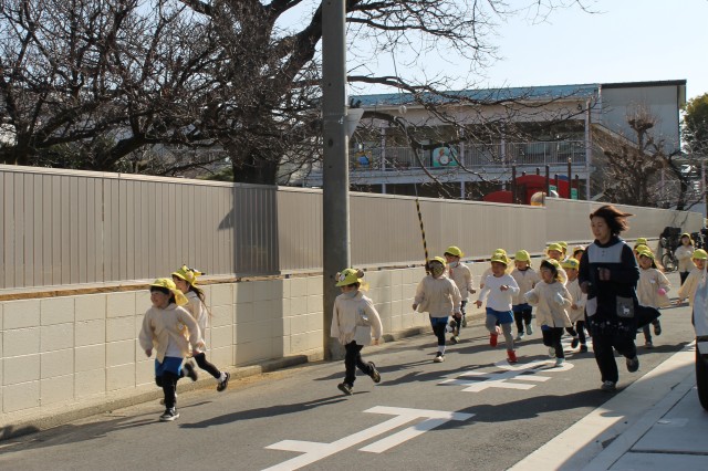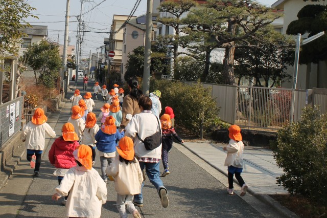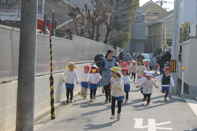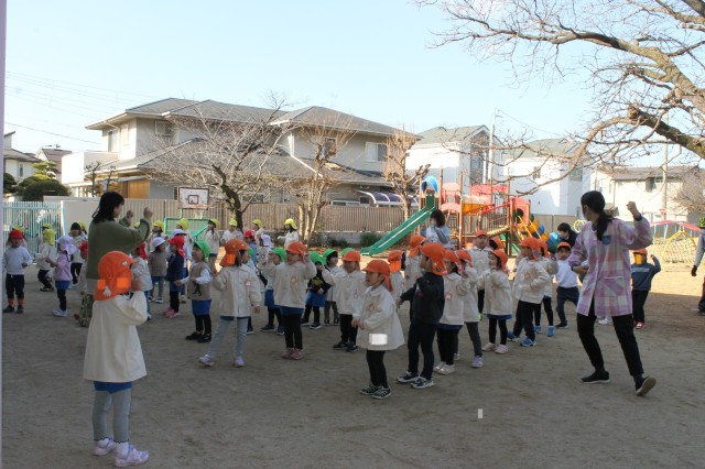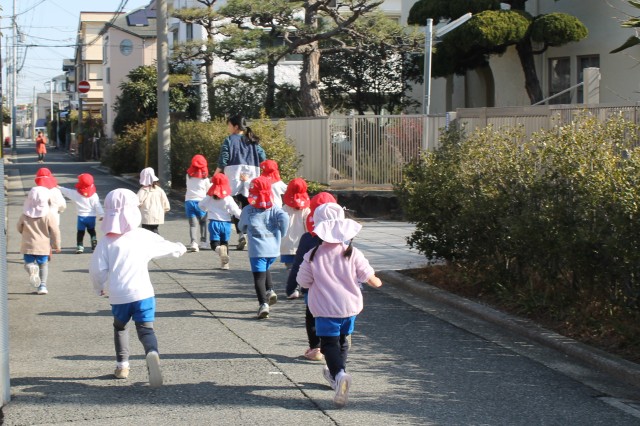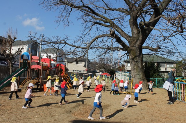1月初めからほとんど毎朝、音楽が鳴ると園庭に出て、体操・マラソンで体いっぱい動かして元気に過ごしている子どもたちです。どんなに寒い朝でも、幼稚園のまわりを1周(年長は2周)まわって帰ってきた子どもたちは、頬を高揚させて息を弾ませながら門に入ってきます。