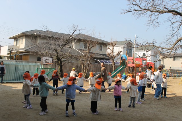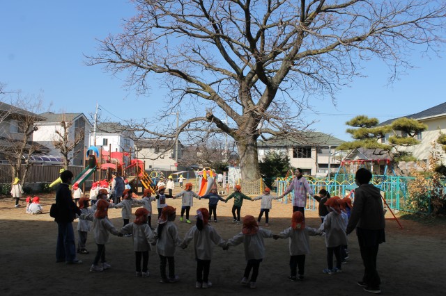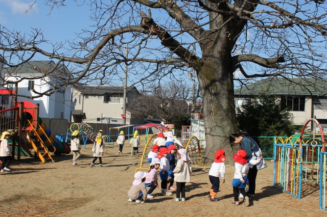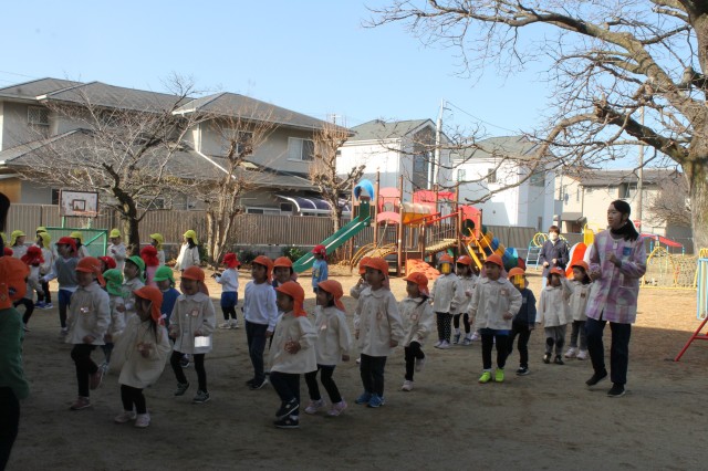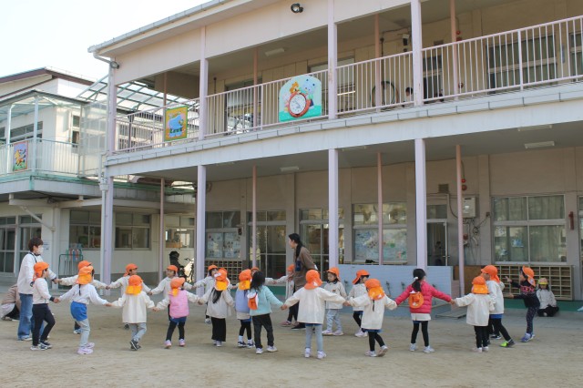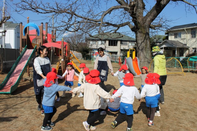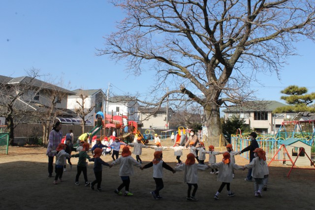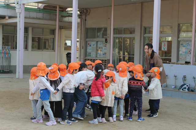 皆戻ってくると、年中組は皆で輪になり手をつないで、なべなべそこぬけ 年少さんは小さな輪に集まって皆であぶくたった どちらも毎日続けているととってもスムーズに出来るようなっています。 冬の恒例行事になっているサムソーヤ体操とマラソンは、卒園生なら皆経験あり!変わらない朝の風景です。