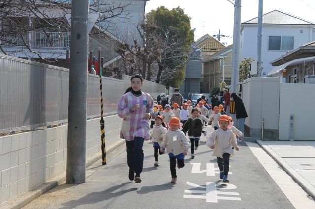 一番小さなつぼみ組さんは園庭の一番奥のお山までよーいどん!はじめはきつかった園周り2周を走りきった年長は、今では余裕も感じられます。