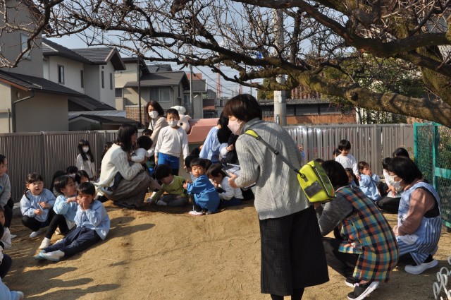 ピンポンパンポン チャイムの音に園内が静まりました。「避難訓練です。台所が火事です。口を塞いでぶた小屋の所まで逃げます。」