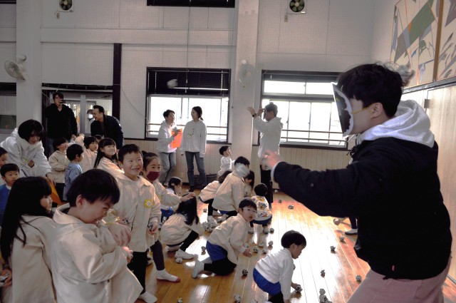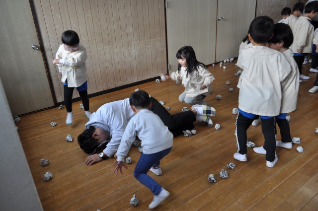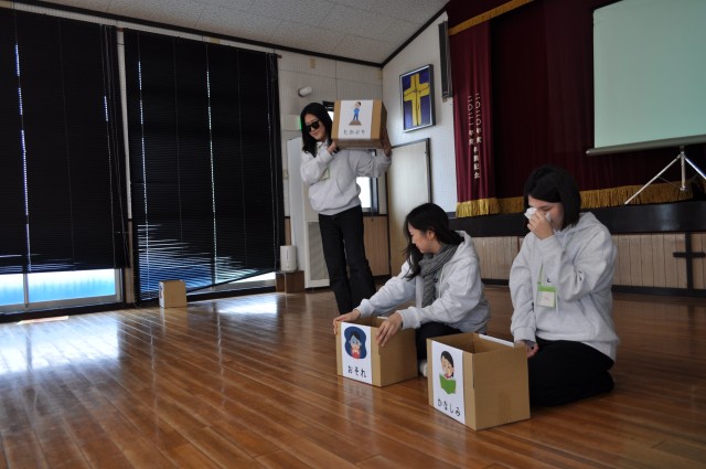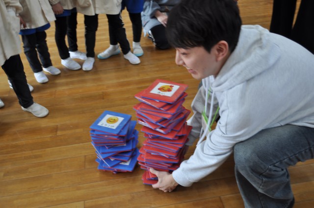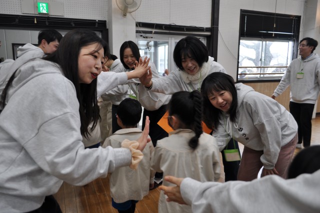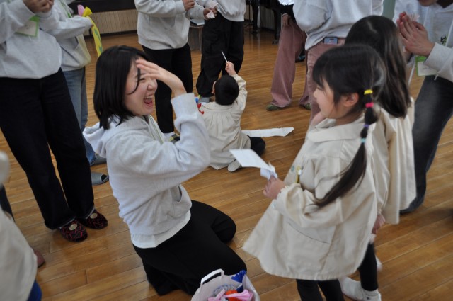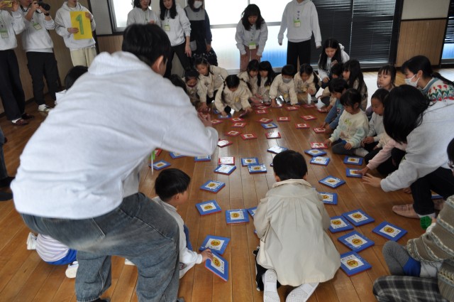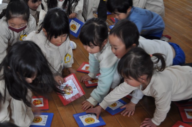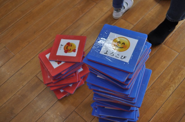 「よろこび」と「あい」のカードをひっくり返すゲームでは、異年齢でのチーム戦。1回戦は「よろこび」チームが勝ち、2回戦は「あい」チームが勝ちました。