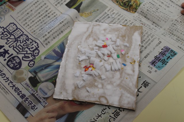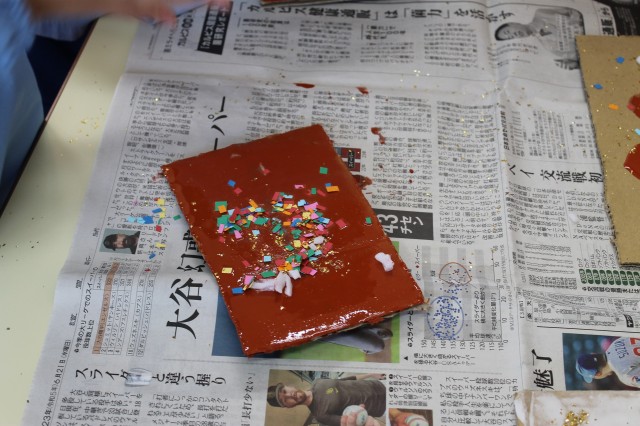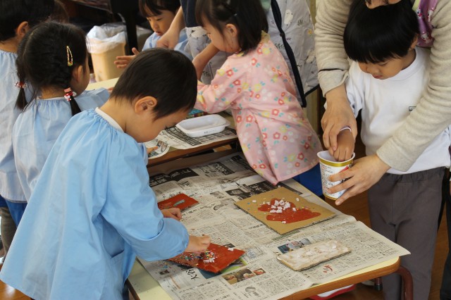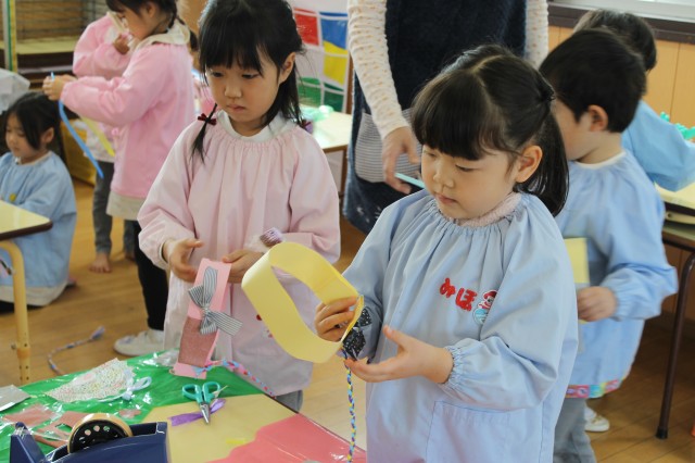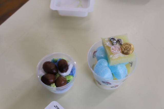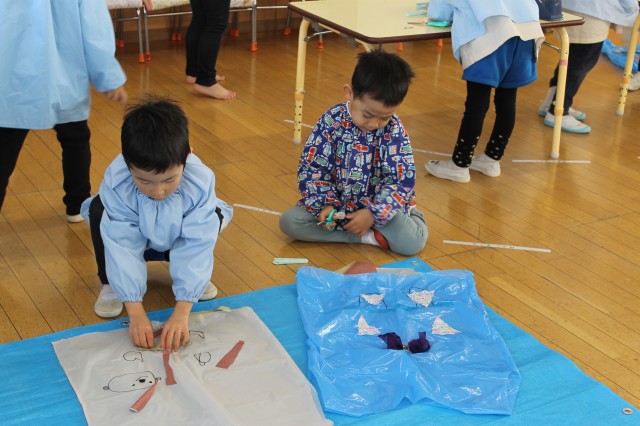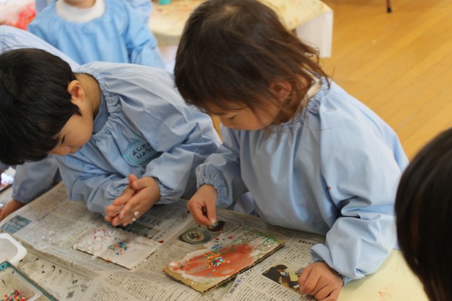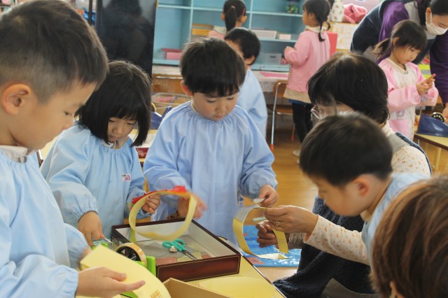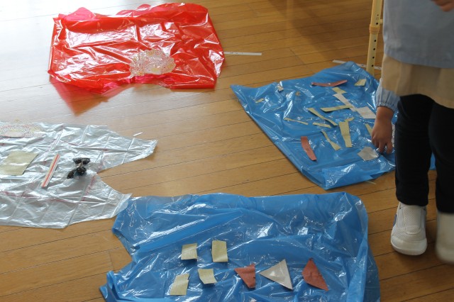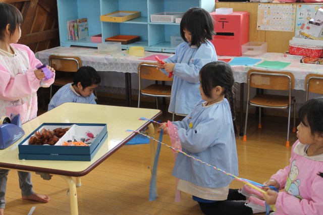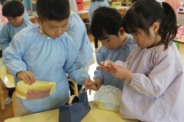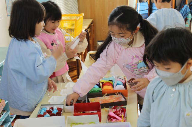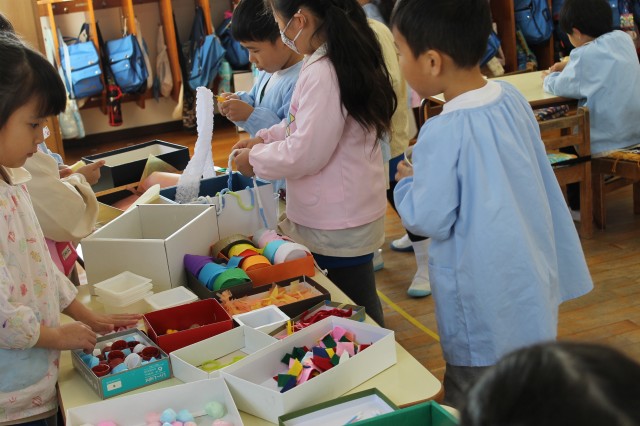 いろいろ出てくる出てくる…お菓子にぬいぐるみ、おもちゃ、服、ネクタイなどなど。子どもたちのアイデアを出来るだけ品物として実現させてあげるために、先生はたくさんの種類の廃材や材料を揃えます。外れたり、壊れたりしないようにどうしたらいいのかヒントを与えたり、こんな方法もあるよと、アドバイスしたり。 きっとお店屋さん当日は、子どもたちの作った素敵な品物がいっぱい並ぶことでしょう。