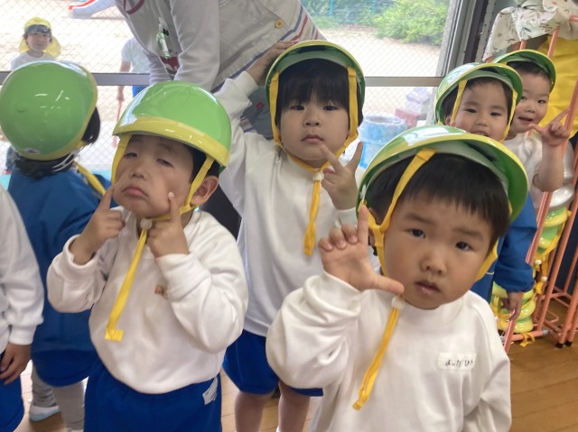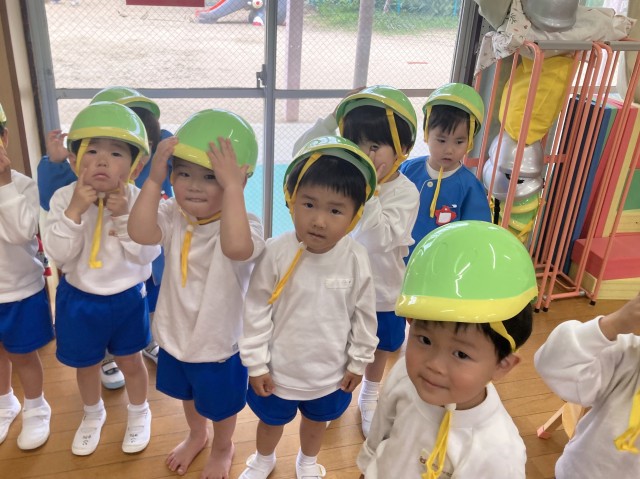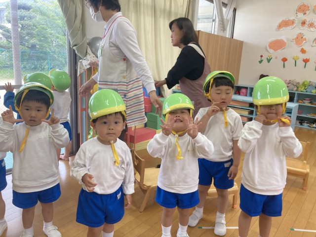今日は地震が起きた時のために、ヘルメットをかぶってみました!まず、揺れが来たら、首の後ろで手を組んで丸まって、