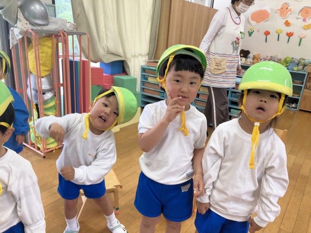 そして、頭を守るためにヘルメットをかぶります。「工事の人みたい!」と、ちょっとわくわくした子どもたち☆