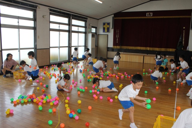 2つ目のゲームは、「ボール集めゲーム」カラーボールをグループのカゴにたくさん入れることができたチームの勝ち!!お遊戯室いっぱいに広がるカラーボールを目の前に、目をキラキラさせている子どもたち。