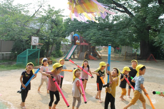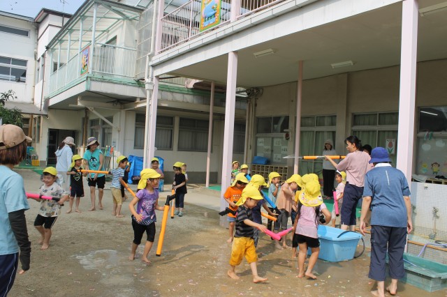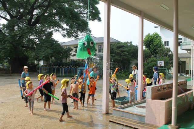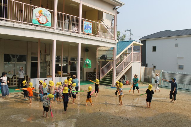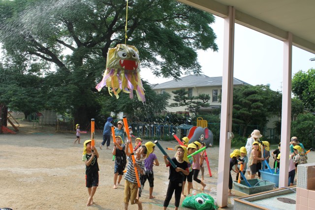 次は、見たことのないくらい大きくて、長い水鉄砲を使った水遊び!!もう、楽しくて、楽しくて、たまらない子どもたち。見ている先生もとっても楽しい!はじめは、お友だち同士で水のかけあいをしていましたが、気づけば先生もびしょびしょ!!一緒になってとても楽しい思い出を作りました。
