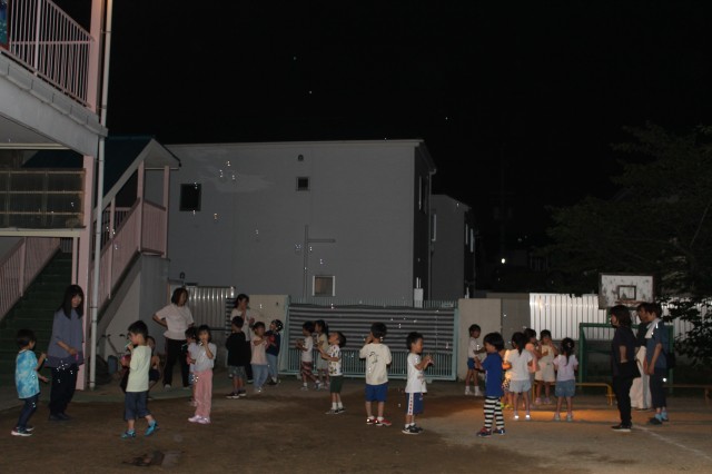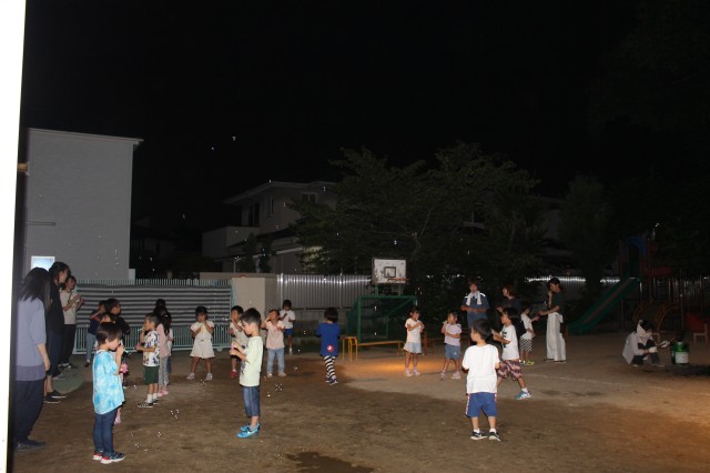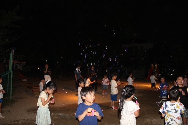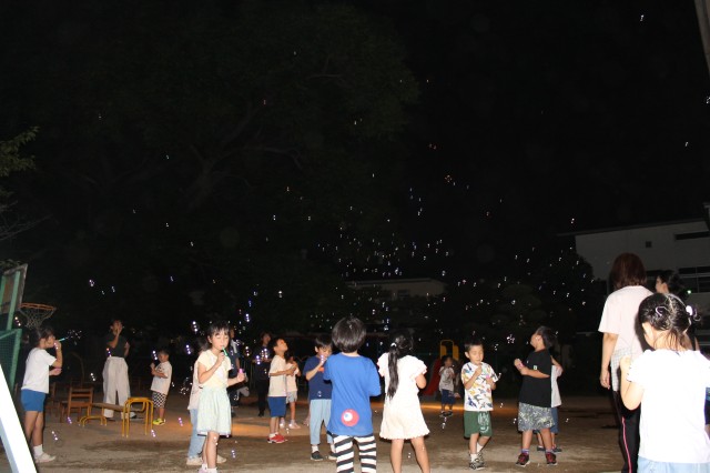 キャンプファイヤー後は、夜のシャボン玉!「夜にやってもいつもと同じや〜」と言っていた子も、テラスの電気に照らされて風に舞うシャボン玉を見て、もう、夢中!!大きいのや、小さいのを作っては、キラキラと夜空に飛んでいくシャボン玉を見つめていました♡