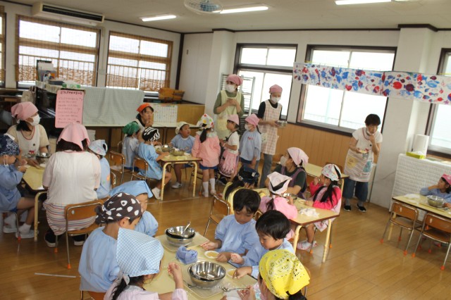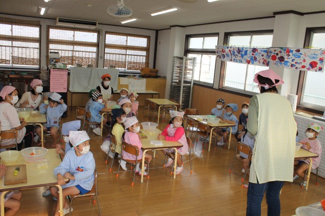 クッキングでは、まず初めにシャーベットを作りました。ボウルに入った氷に塩を入れると、どんどん冷たくなって・・・その冷たくなったものの上にボウルに入れたジュースをのせると、ジュースがシャーベット状に、その場で食べて・・・美味しかったです!!