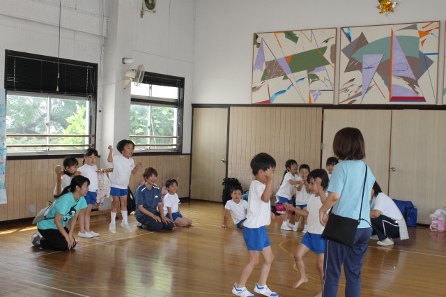 1つ目のゲームは、「ドン!じゃんけんポン!」2グループに分かれ、床にある白線を辿って、両側からスタート!!お互いが出会ったところで、両手を合わせて「ドン!」「ジャンケンポン!!」負けたら、自分のグループに戻り、勝ったら、どんどん進んでいくことができる遊びです!