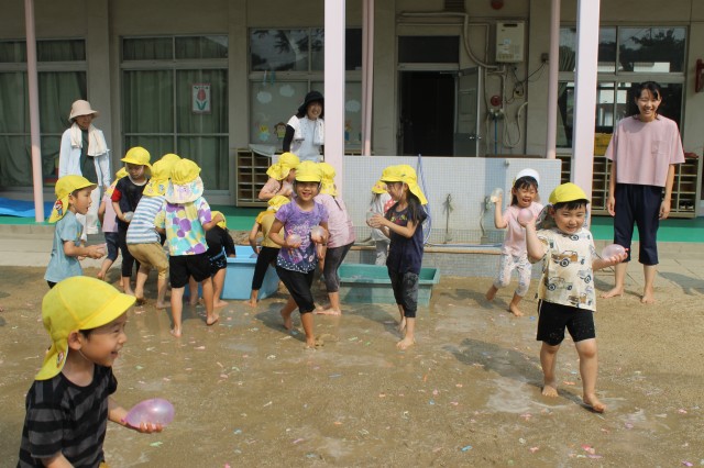 子どもたちの楽しみランキング上位にランクインしていた、「水遊び」。どろんこセットに着替えるだけで子どもたちのテンションはMAX!!園庭に出てみると、水風船がたくさん浮かんでいる!!両手に水風船を握りしめるだけで、子どもたちの目はキラキラ☆ まずは、みんなで投げてみよう!!