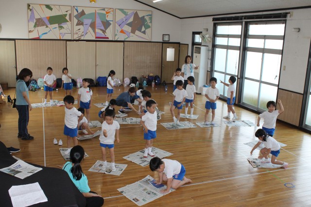 どんどん小さくなっていく新聞紙の上に必死に立とうとする子もいれば、余裕の表情で、新聞紙の上に広々と乗っている子も✨ みんなで楽しむことができました!