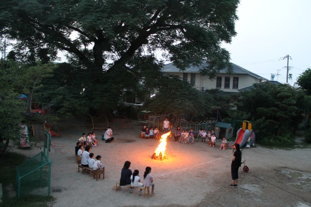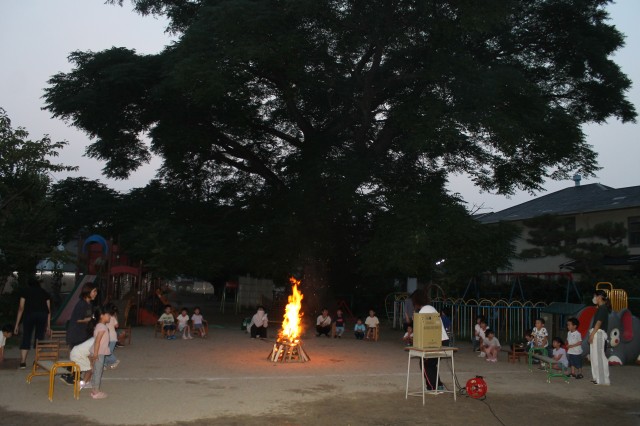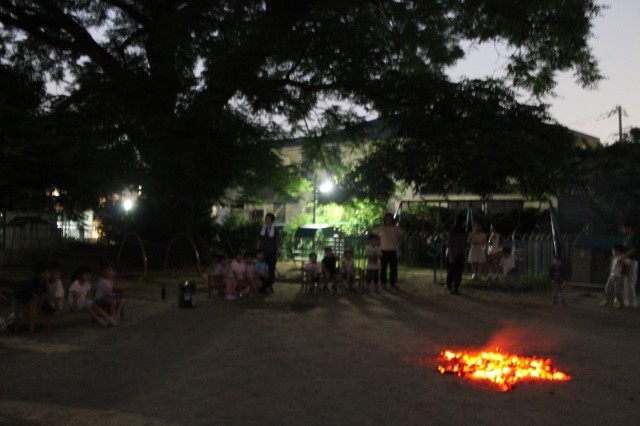 1日の終わりは、キャンプファイヤー!!子どもたちは、段々薄暗くなっていく外の様子にワクワク、ドキドキ!!「いつもなら、もう家に帰ってるけど、今日は、幼稚園やな!へへっ!」と子どもたち同士で楽しそうでした。「どうやって火をつけるのかな〜」と興味津々の子どもたち。火をもった先生が入場してくると、じーっと見つめていました。火がついてからも、静かに火の様子を見ていました。
