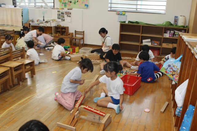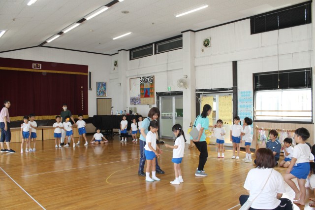 シャワーを浴びたあとは、たんぽぽ組のお部屋で遊びました。いつものたんぽぽ組のお部屋に今日は、先生がたくさん!!いつもの遊びを友だちや先生と楽しむことができました。「お片付けしたくない〜でもお腹空いた〜」とお部屋遊びにも満足している子どもたちでした!