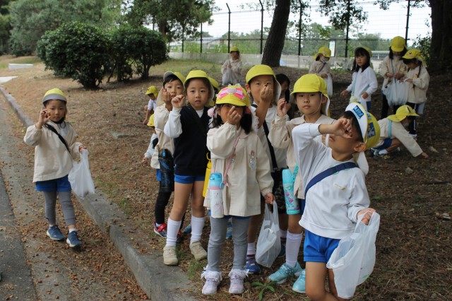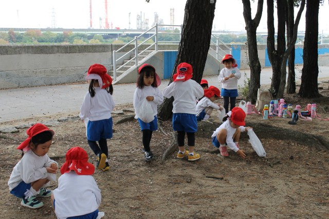 どんぐりがたくさん落ちている場所に直行!わあ!たくさん落ちてる~はじめは何も考えずにどんどん拾って袋に入れていた子も、友だちが大きいの見つけたよ。黄色と茶色が混ざってきれいなの見つけた!帽子付き、ちいちゃな赤ちゃんどんぐりもあった。色んな種類のどんぐりを見つけるのが楽しくなってきました。たんぽぽ組さんはもう少し奥のさらにたくさん落ちている場所に行きました。もう袋が破れそうなぐらいたくさん入れておみやげです。
