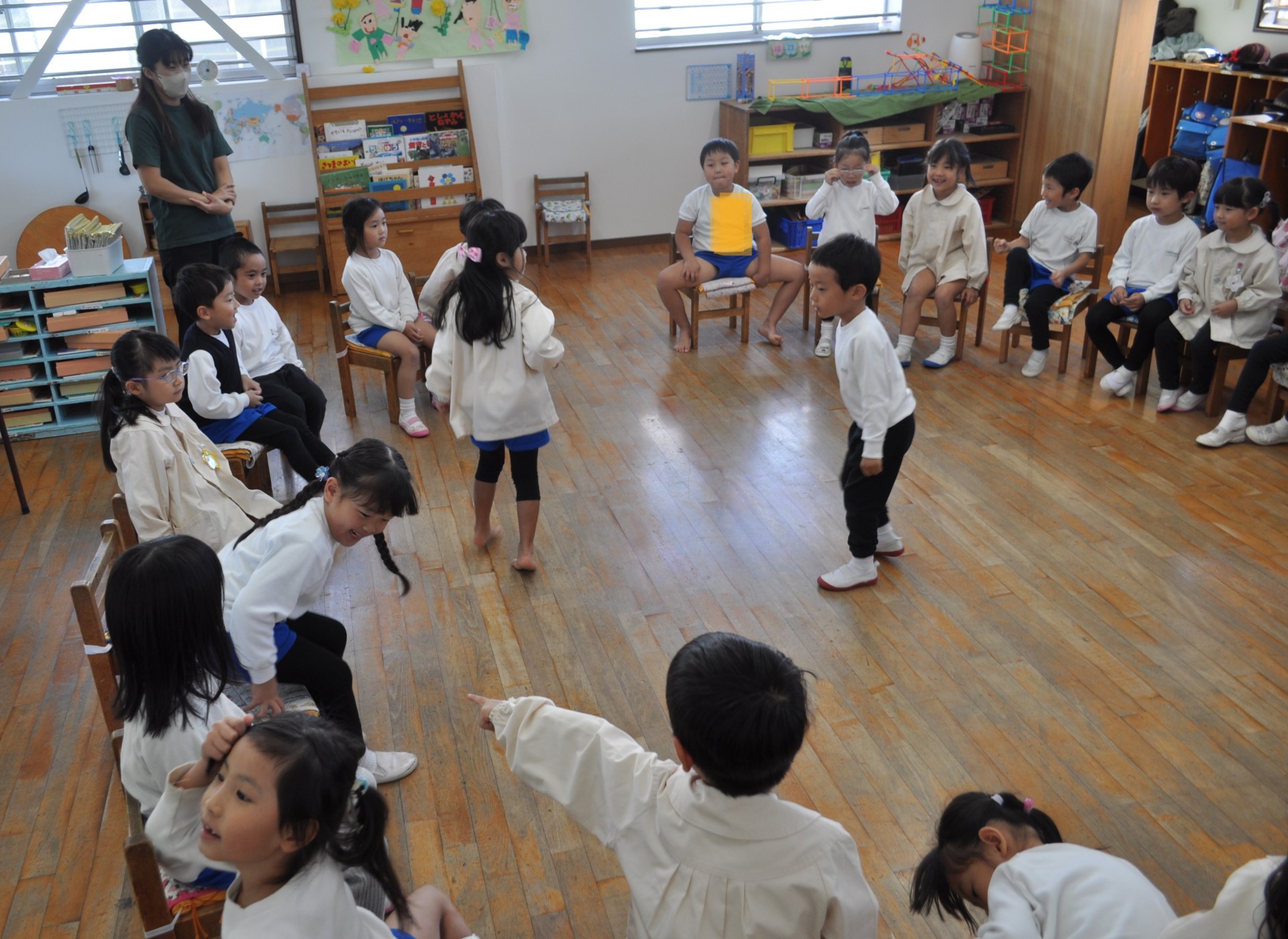 たんぽぽ組で「なんでもバスケット」が盛り上がった今日。「朝ごはんを食べた人」「靴下履いてる人」「長ズボンを履いてる人」等、自分たちでお題を考えて出来るのが年長さん。面白かったのは「朝、歯磨きして来た人」のお題に、半分ぐらいの人が立ち上がらない、、、「えっ?朝、歯磨きしないの?」と尋ねると「夜してるから良いねん」、、、とのやり取りも含め、楽しいひと時でした。ルールのある遊びを楽しめる年長さんの成長を感じた一幕でした。