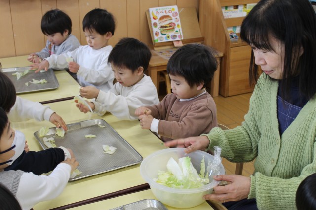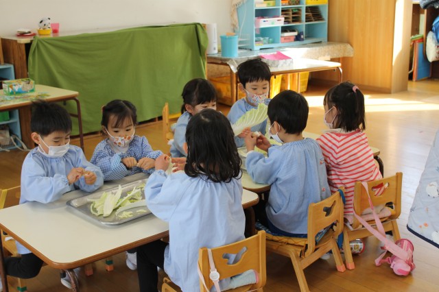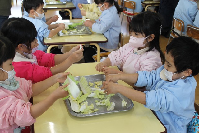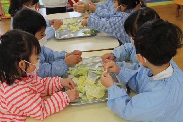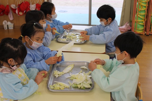 今日は冬のお野菜、白菜をみんなで食べる日。その前に実際に白菜を大きな葉っぱのまま手で触って、小さくちぎる体験をしました。