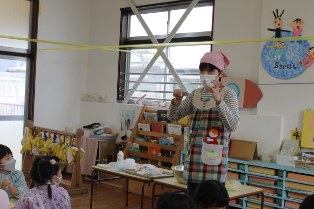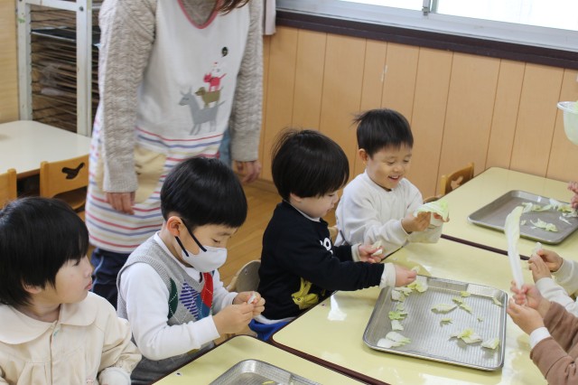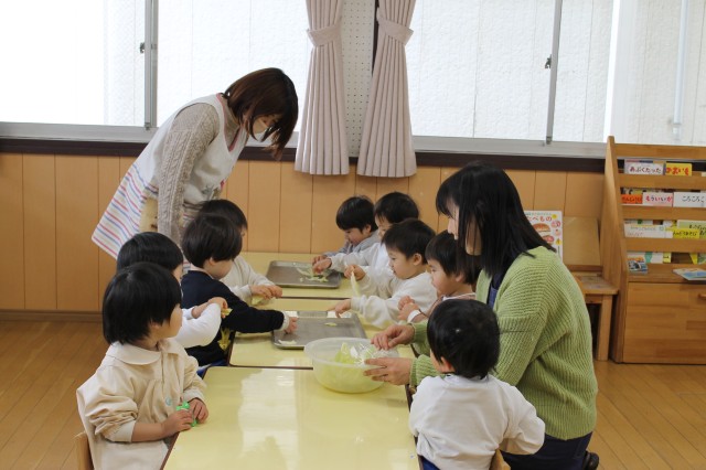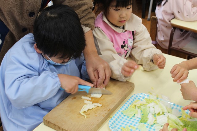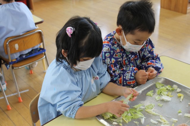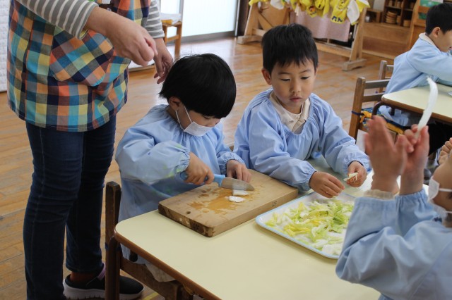 年長のたんぽぽ組は芯を包丁で切ることに挑戦です。ランチの先生から包丁の使い方、反対の抑える手は猫の手ね!とおしえてもらい、どの子も慎重に切り始めました。全部切り終わると、細かく切れたね~とほめてもらいました。今日のランチのおかずにして持って来るからお楽しみに!