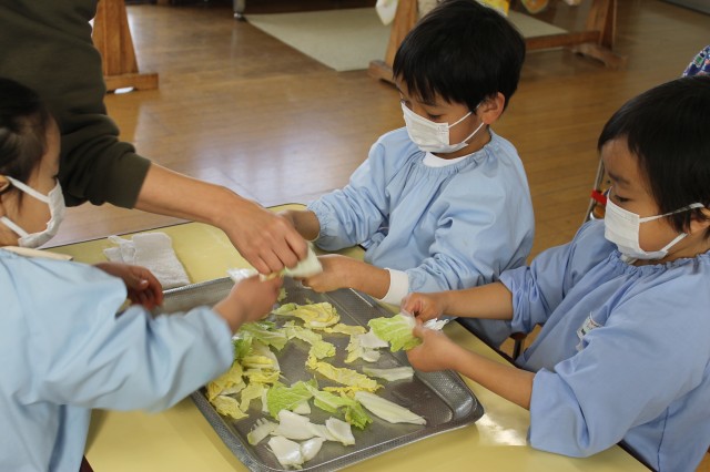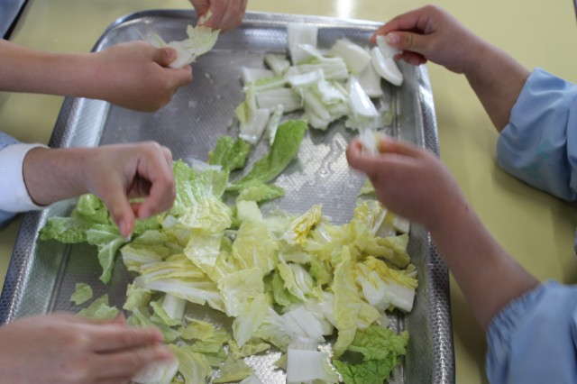 「白菜は今が一番おいしい野菜、風邪をひかない強い体をつくる役目もしてくれるんだよ…と説明を受けて前に置かれた白菜を手に取り、さっそく始めます。