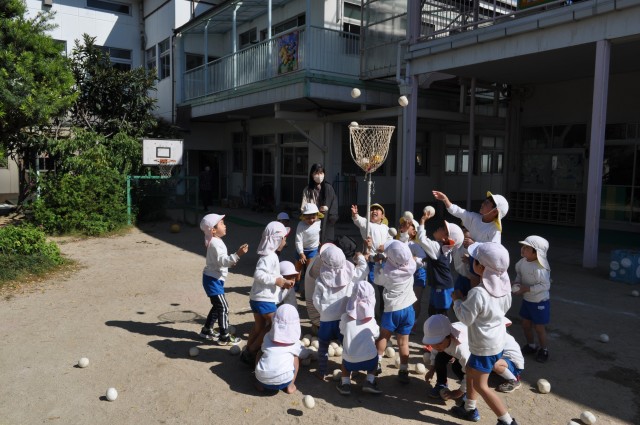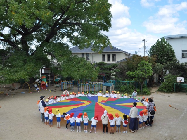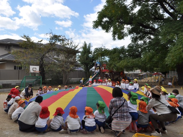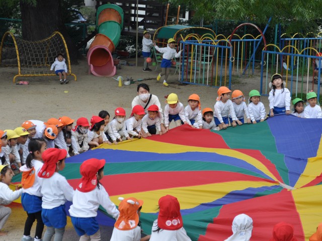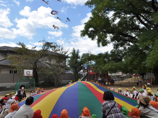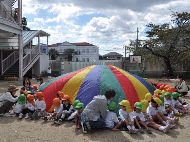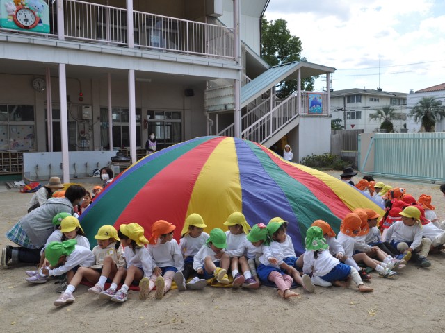 もう一つ運動会の季節に思うことがあります、それは全園児が揃って顔を合わす中で生まれる年長者に対する憧れ・尊敬の気持ち。自分より小さい人への思いやり、優しさの心が育っていることです。組体操の演技を見ている年中の子どもたちの表情は、すごいな~かっこいいなぁと感じているのと同時に、次は自分たちなんだ!とどこかで覚悟しているような・・・。毎年の恒例で、運動会後の一週間は、学年混ざっての運動会ごっこを楽しみます。小さなお友たちも中に入れてあげて、色とりどりの帽子が混ざってのパラバルーンや年少対年中組の玉入れなど…とても楽しい時間です。