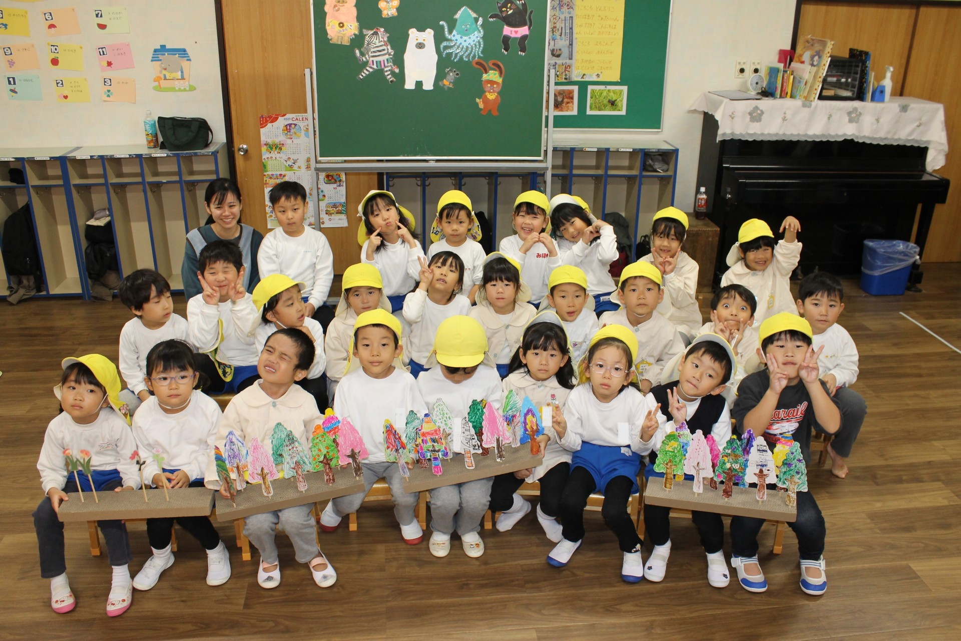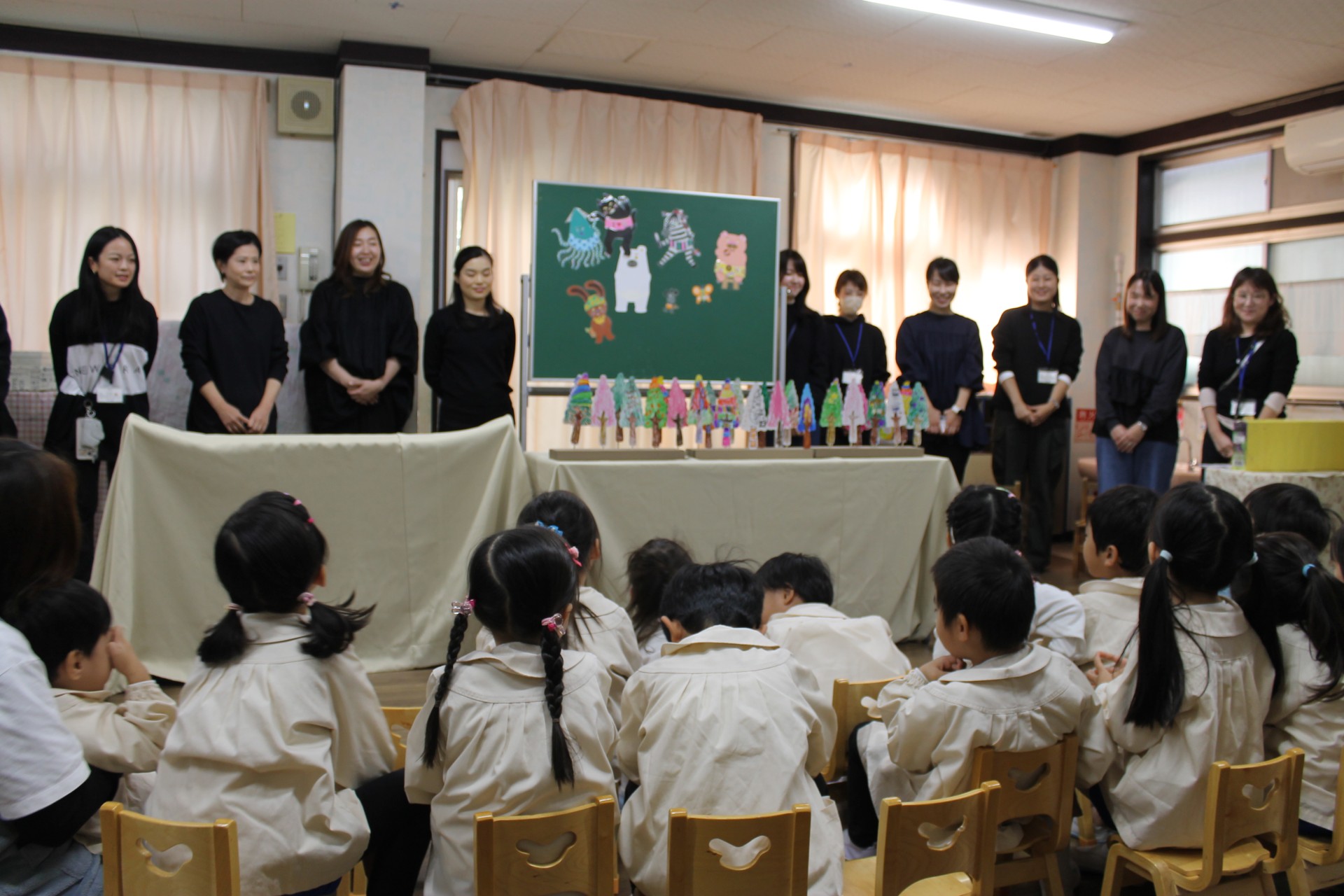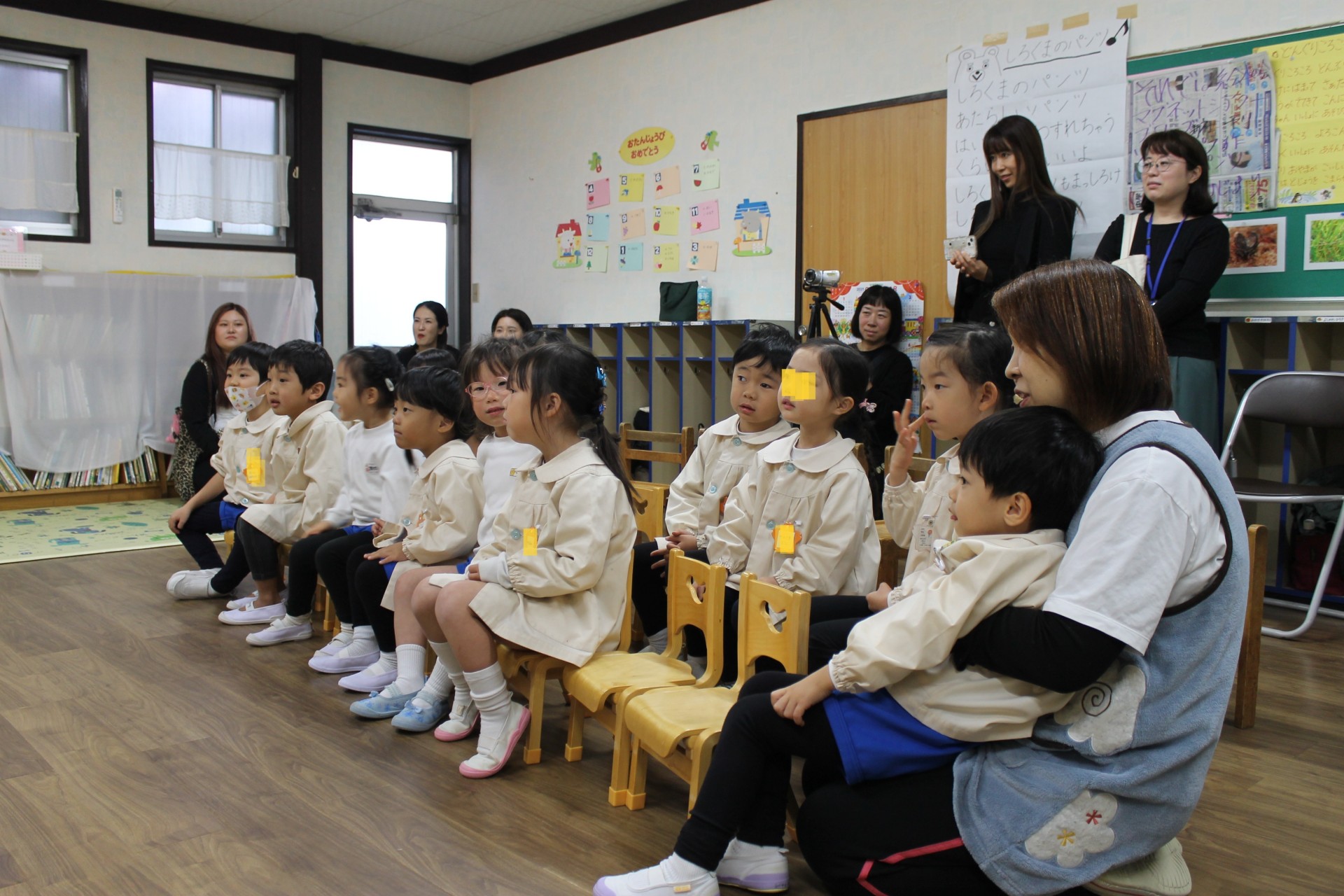 今日は絵本の会のお母さんたちによる、マグネットシアター上演の日でした!題材は『白くまくんのパンツ』 絵本の絵をくり抜いて、ラミネートをかけてボードに貼りながら、お話しが進みます。お話しに入る前に木の陰に隠れている動物を当てるクイズがあり、スタートから子どもたちは前のめりで一生懸命考えて手を挙げていました。年少・年中・年長クラス別で3回公演。
