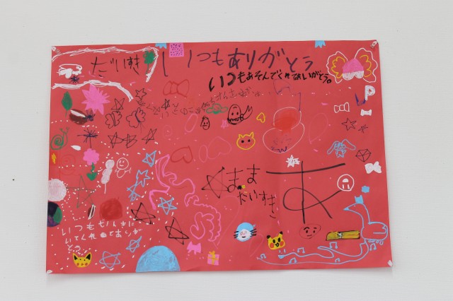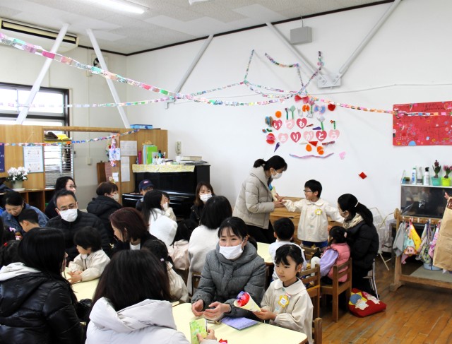 そして、おうちの人の手を引いて、みんなで飾り付けをしたお部屋にご招待☆ かわいい飾り付けに思わず上を見上げてしまいます。心を込めて作った手紙と花束をサプライズでプレゼントしたり、ミニミニお菓子パーティーをしたり、短い時間ですが、親子で楽しい時間を過ごすことができました。子どもたちの気持ちも伝わったかな♡