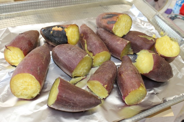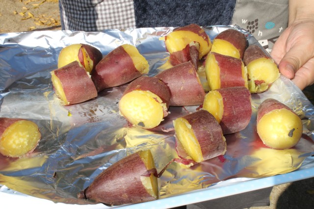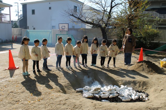 しばらくしたら、ホッカホカの焼きいもの出来上がりです。「いい匂いだね。」 「甘くて美味しいね。」 にこにこ笑顔で美味しくいただきました。