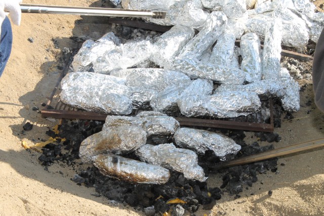 まず、さつま芋を新聞紙で包みます。それを水の入ったバケツにドボンと浸けて、次はアルミホイルで包みます。さあ、準備は完了!!