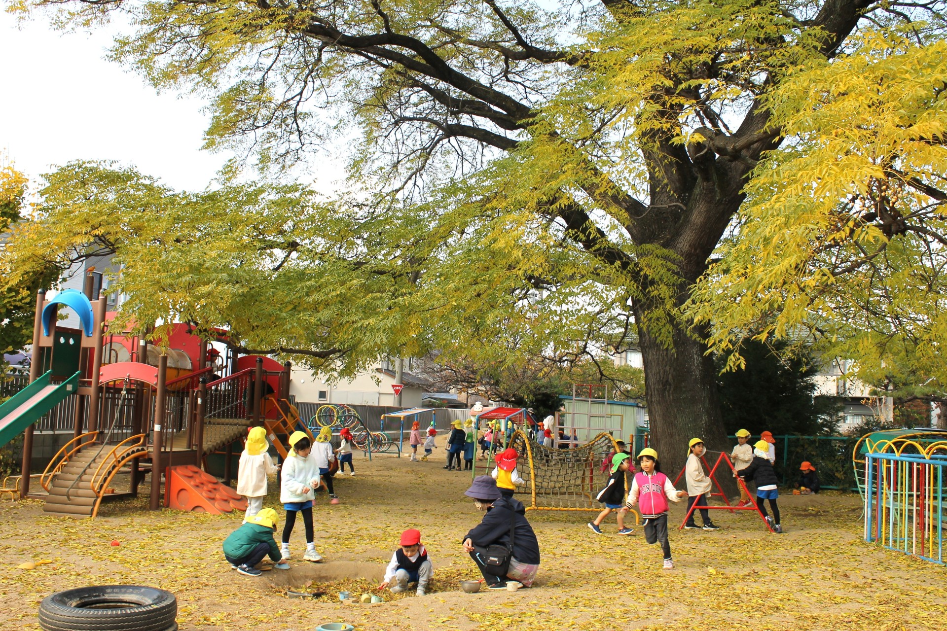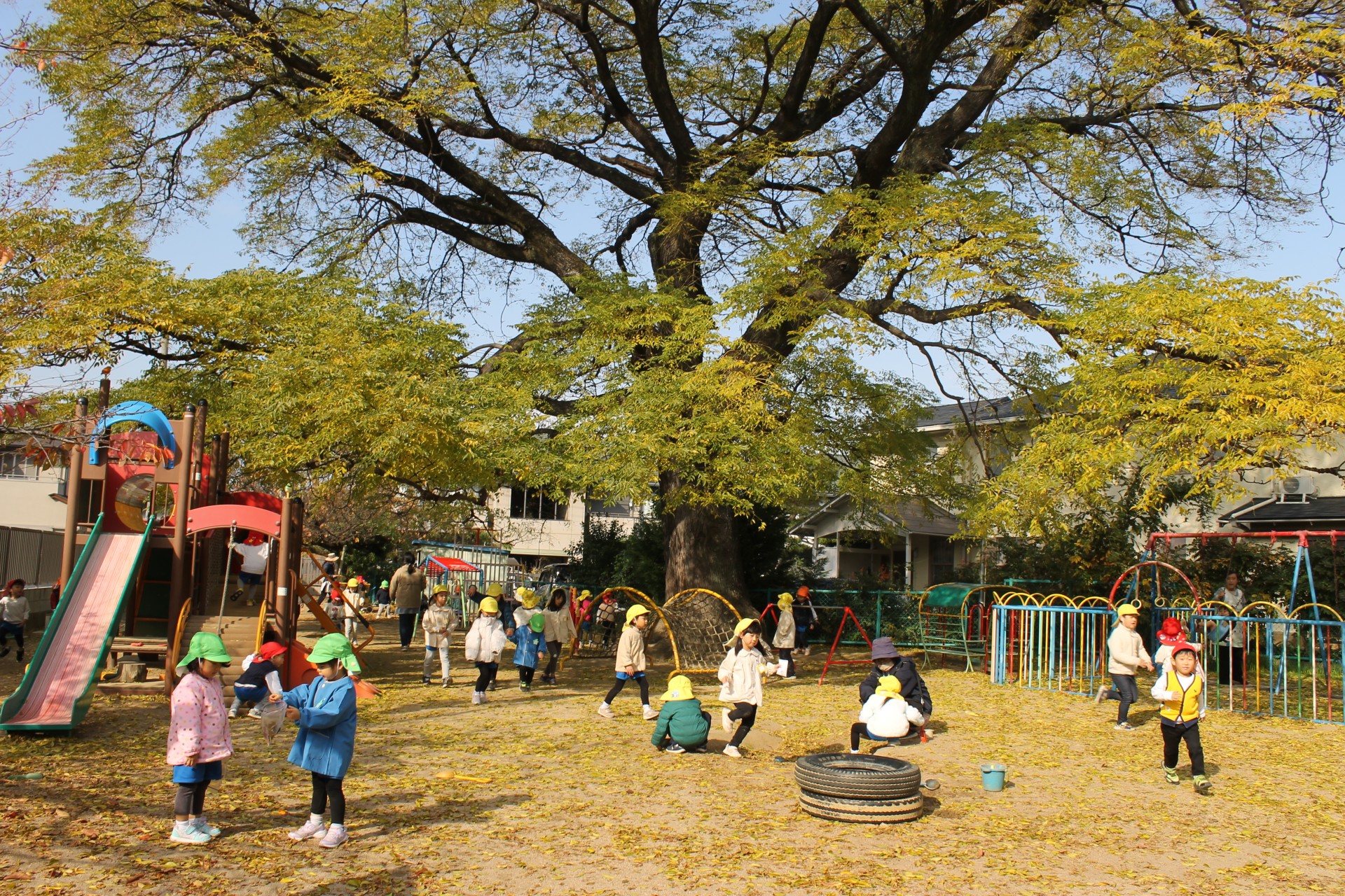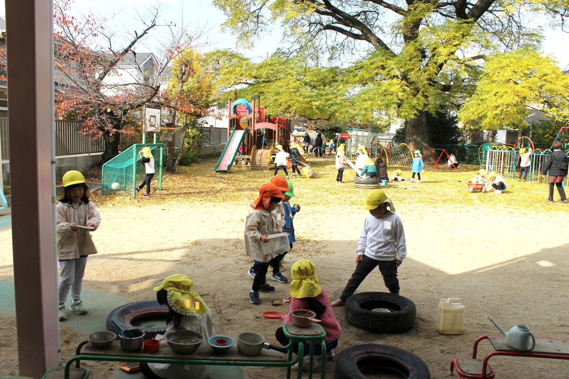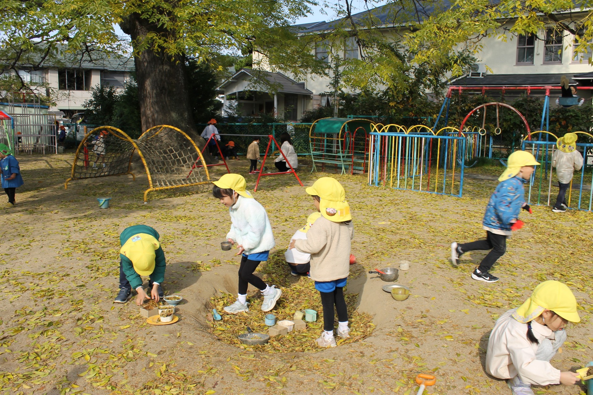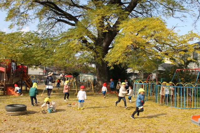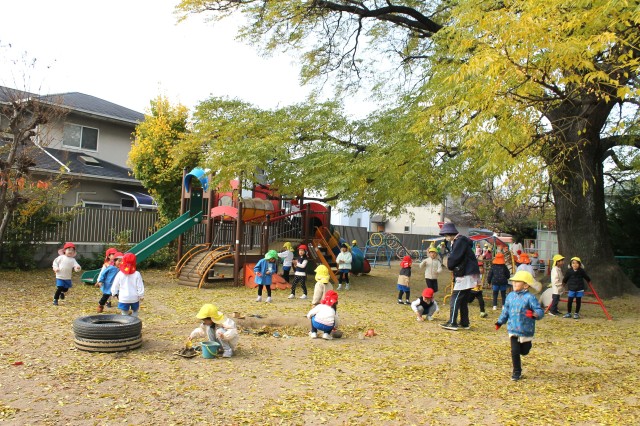 急に寒くなりましたが、今日の幼稚園のお庭は黄色い葉っぱが雪のように舞って、目に映る所が全部素敵な世界でした。正面の木も地面も降ってくる葉っぱも全部黄色!遊びに来てくれた小さなお友だちも、可愛いおててで空を指さし、見たり感じたり触れたり。幼稚園のお友だちも風の贈り物を受け取りながら、創造力が動く動く!!お料理のレパートリーも豊かになり、身体もますます動き出す!!最高のお庭遊びの一日になりました。お遊戯室ではクリスマスに向けて劇の練習にも一生懸命。どのクラスも本当に生き生きと演じています♡