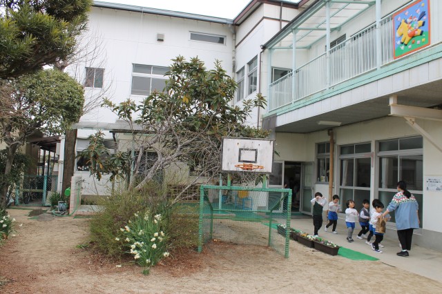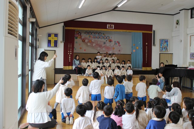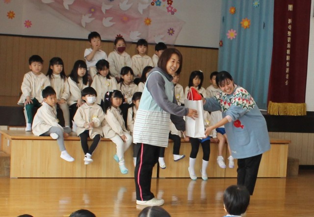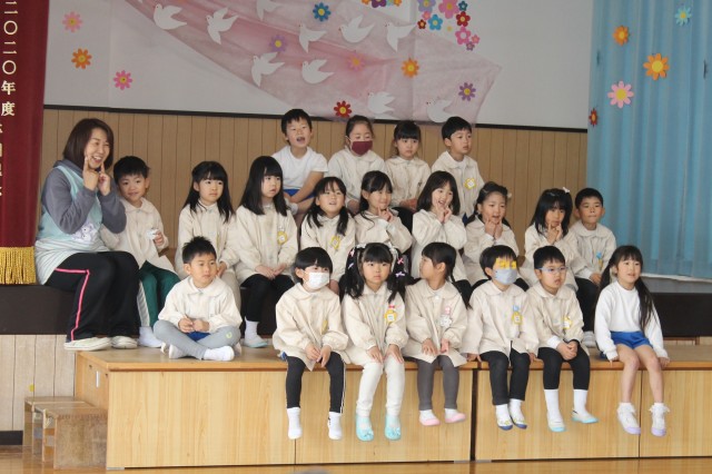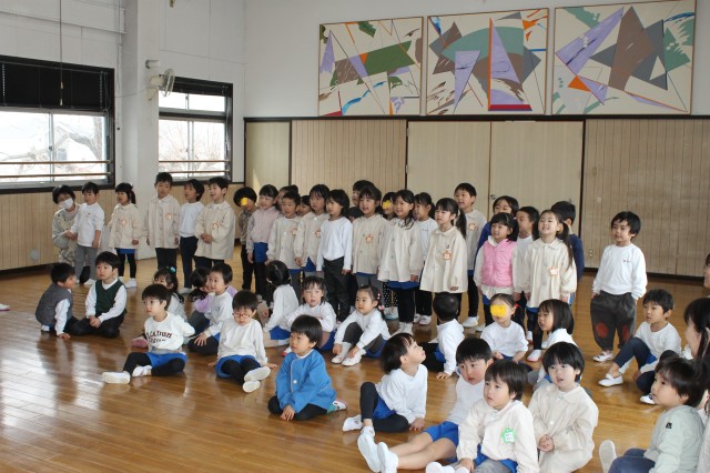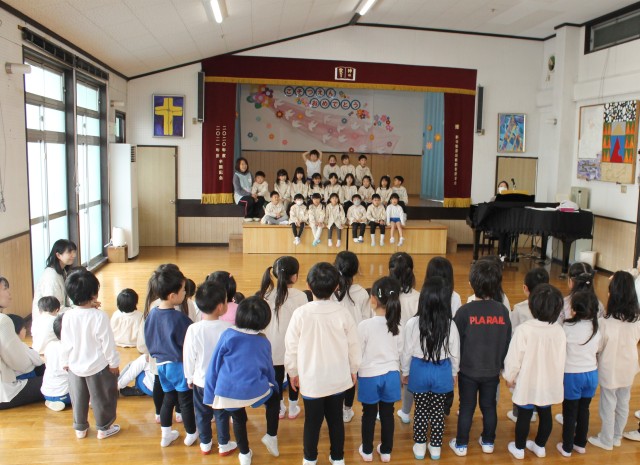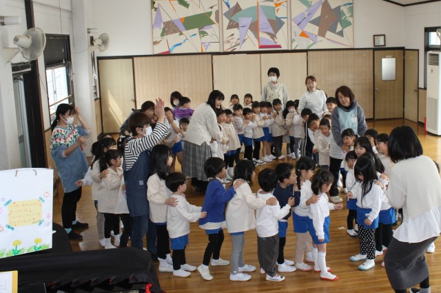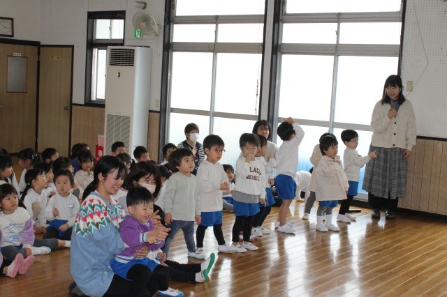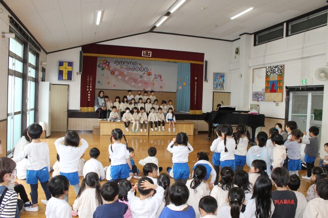次は、満3歳クラスつぼみ組・年少ちゅうりっぷ組・年中ばら組それぞれのお友達からのお歌のプレゼント。一緒に遊んでくれたお兄さんお姉さんたちに、ありがとうの気持ちを込めて歌いました。贈る側、受け取る側、お互いが本当に良い表情をしていました。その後に、幼稚園全員でのじゃんけん列車。「外れないようにここを持ってな」と優しく教えてくれる年長さん。とっても楽しい時間になりました。