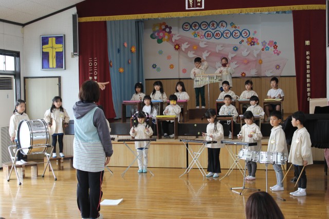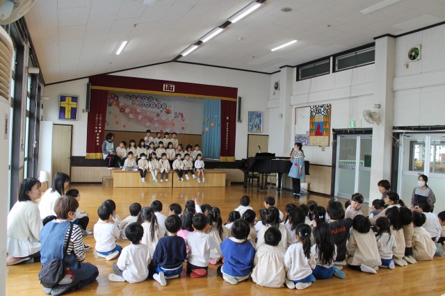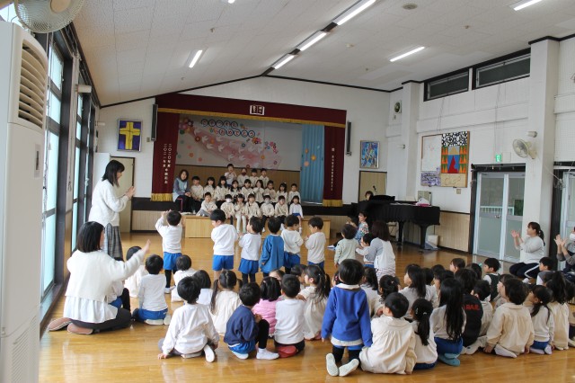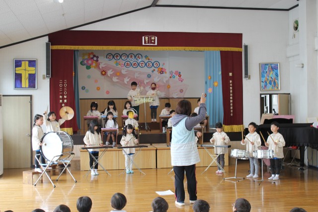今日は年長組さんとのお別れ会の日でした。一番初めは、年長のたんぽぽさん組さんからの、合奏のプレゼント。心が合わさった素敵な演奏に感動しました。
