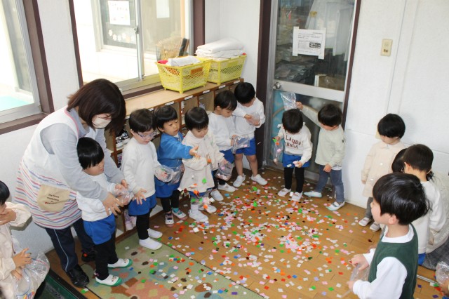 一番最後は、毎年恒例の花道での紙吹雪です。「おめでとう!!」の言葉と綺麗な紙吹雪の中を年長さんが通り抜けました。