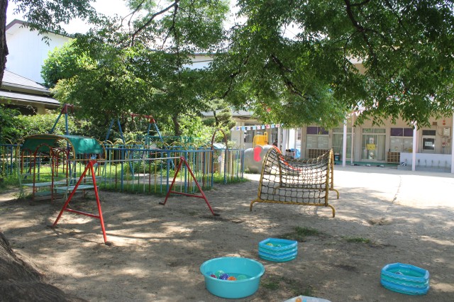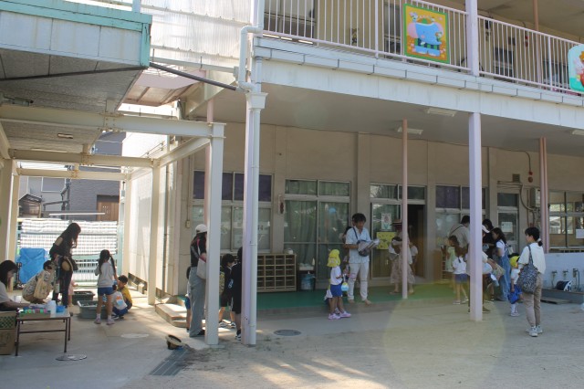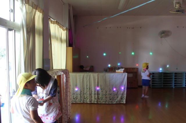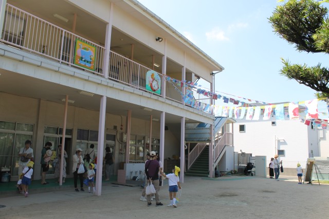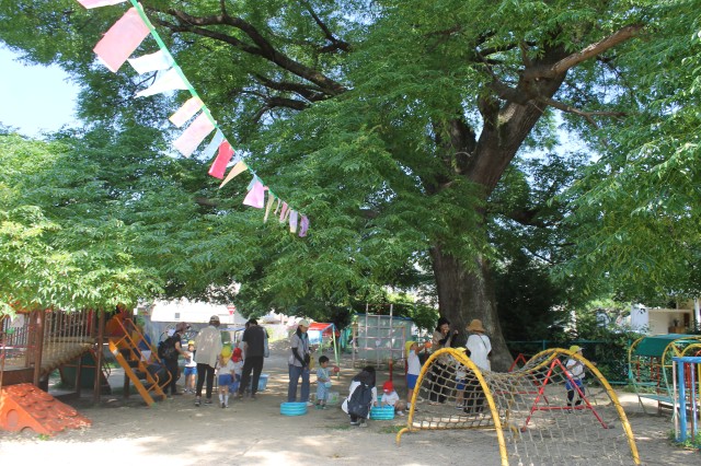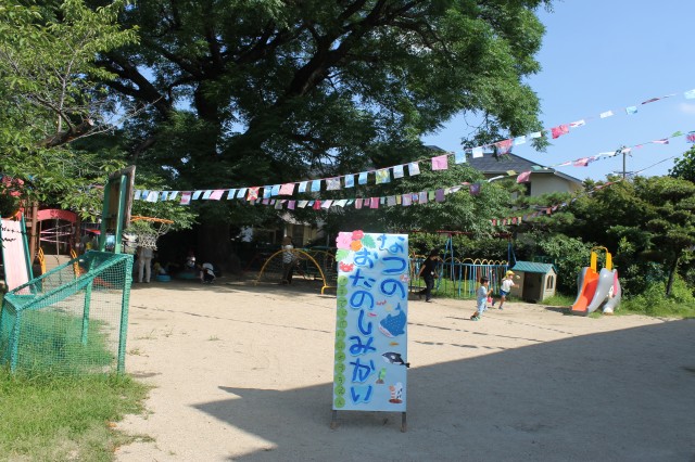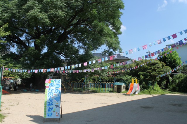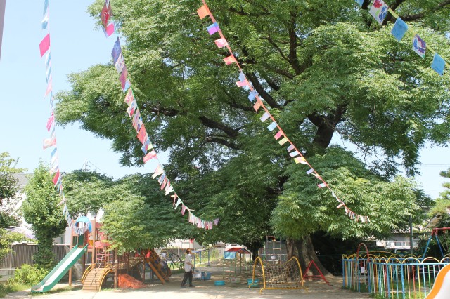 今日は夏のお楽しみ会!園庭には、子どもたちの作品で作った旗が揺れています。