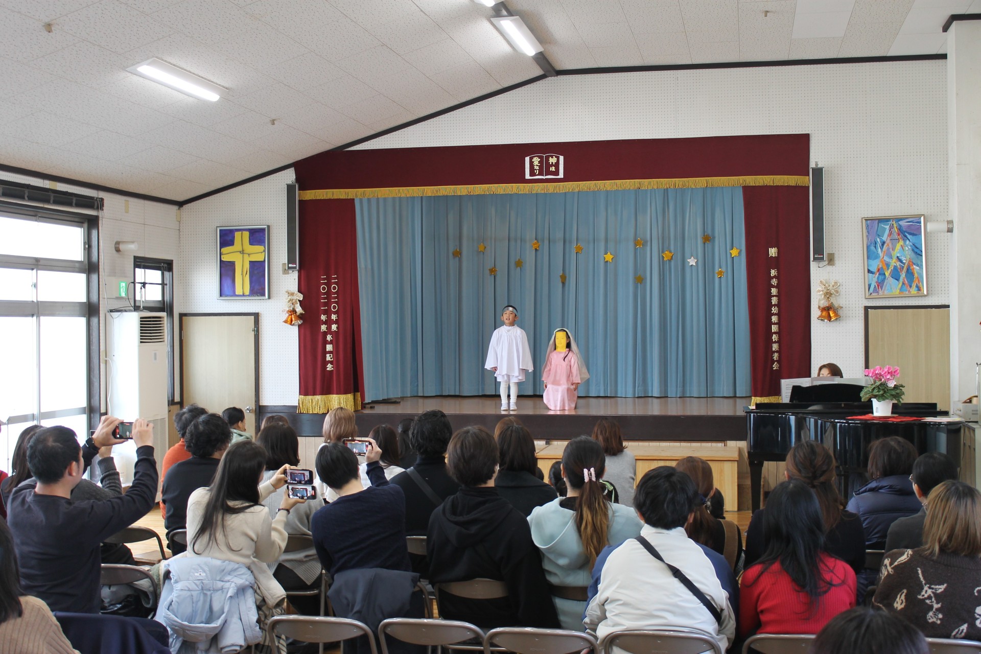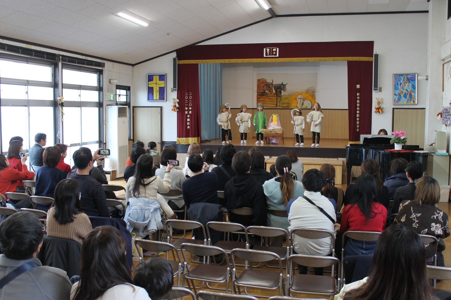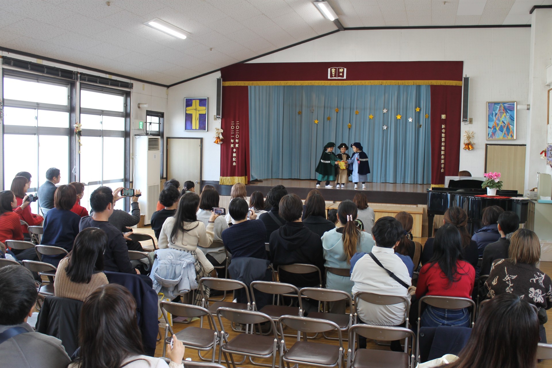 イエス様のお誕生を世界中でお祝いするクリスマス。子どもたちは、イエスさまのお誕生のお話しを聖書から少しづつ聞き、喜んでクリスマス祝会の日を迎えます。アドベンツクランツを一本をずつともし、祝会の日を待ちつつおうちの人へのプレゼントを作り、舞台での劇の練習、導入、役決め、劇への取り組み…毎年毎年色んなことがありますが本当に喜んで楽しんでる様子がうかがえます。